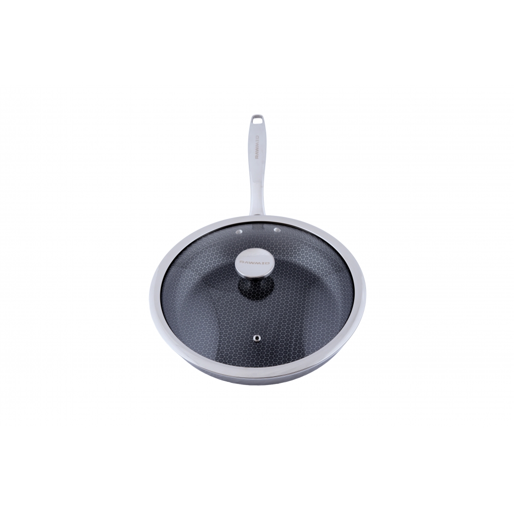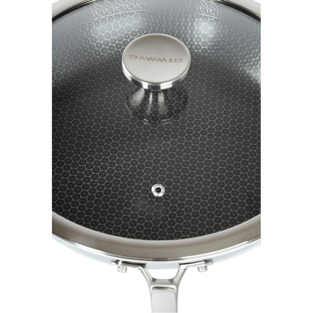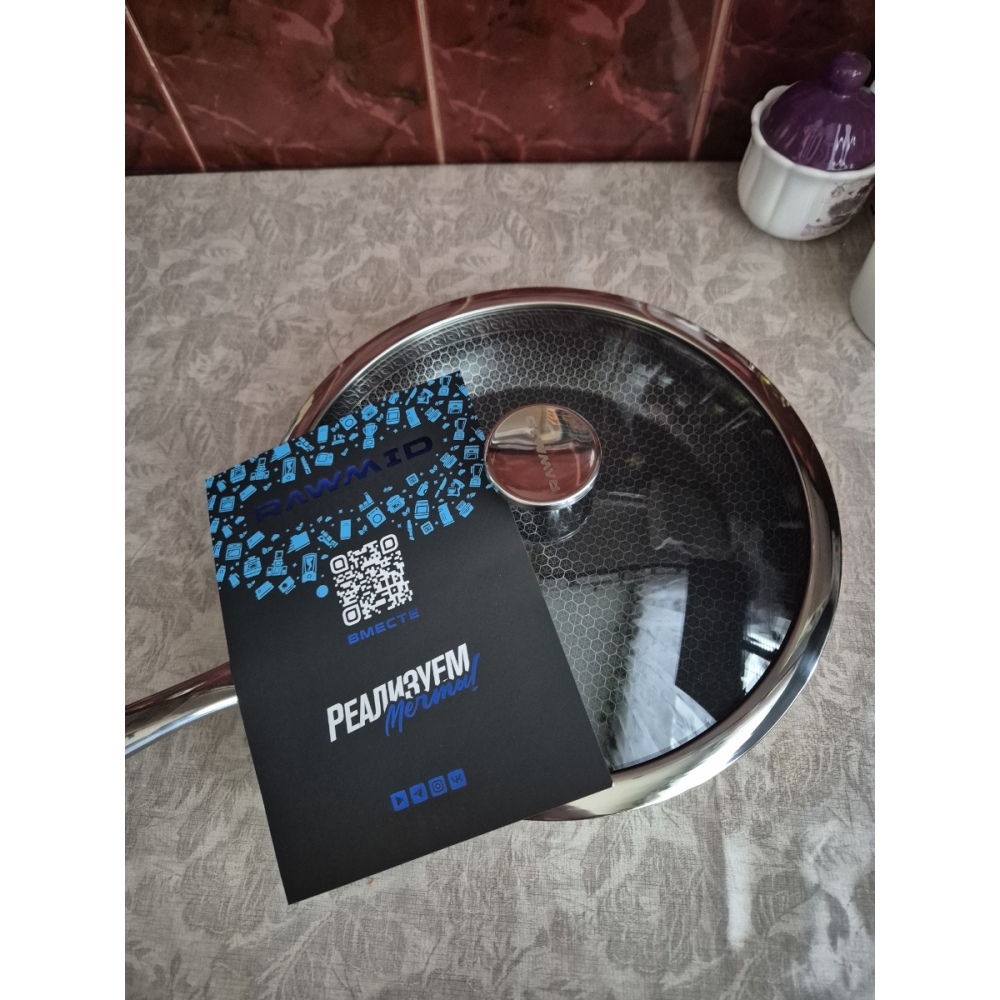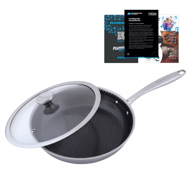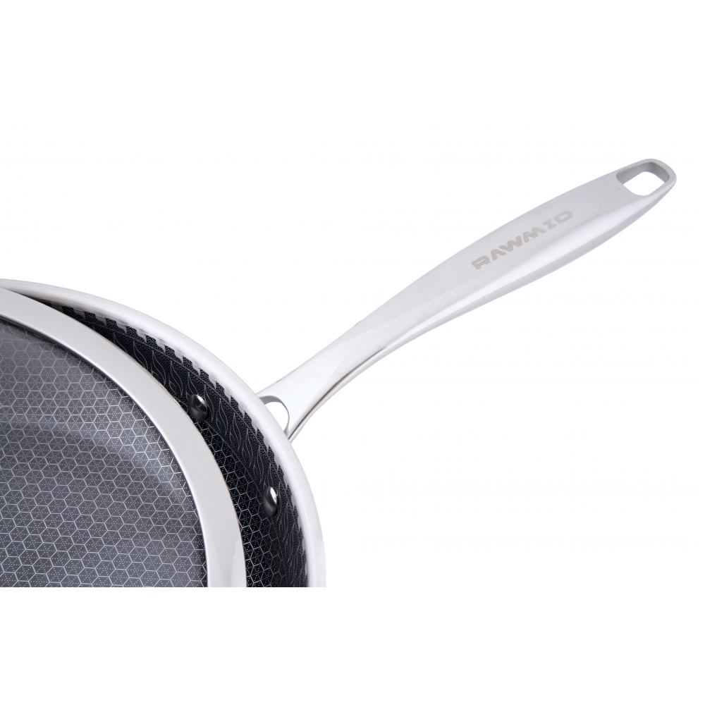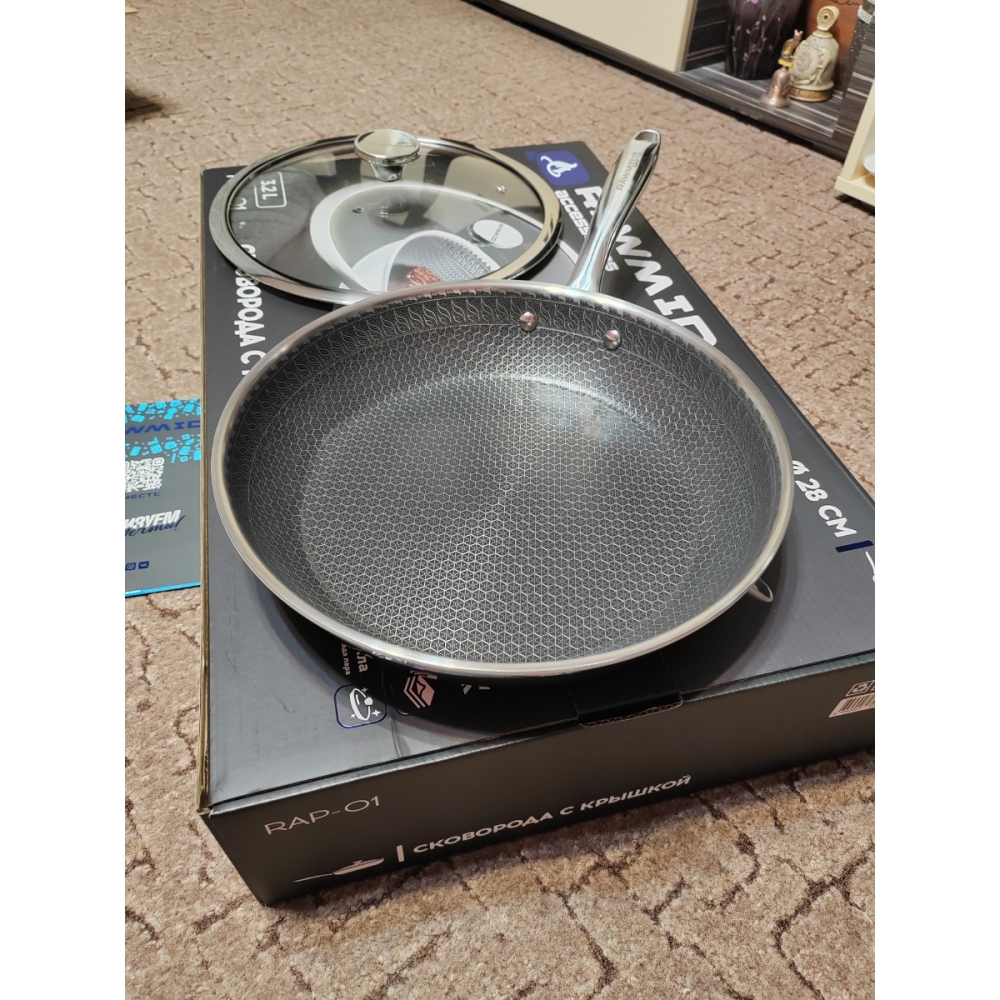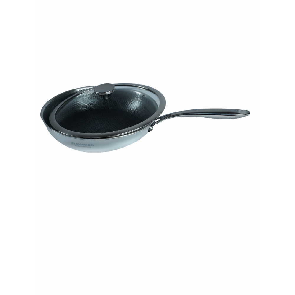 RAWMID RAP-01 — универсальная сковорода с крышкой из трёхслойной стали и керамическим антипригарным покрытием Whitford FUSION. Внутренняя поверхность усилена технологией Honeycomb, которая повышает износостойкость и защищает покрытие от царапин. Трёхслойный корпус с алюминиевым сердечником обеспечивает быстрый и ровный нагрев без горячих точек, что делает сковороду удобной как для жарки, так и для тушения или запекания.
