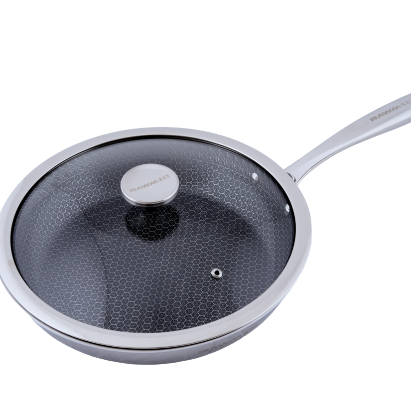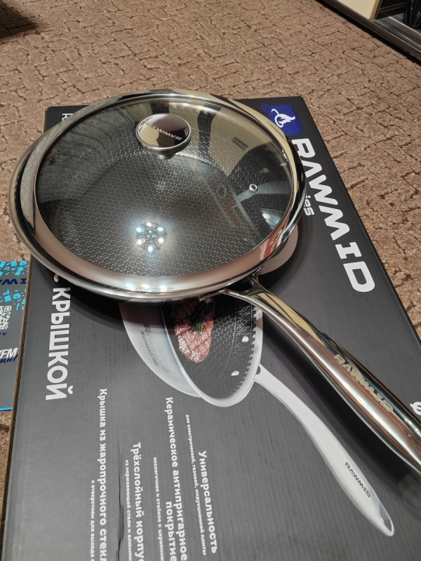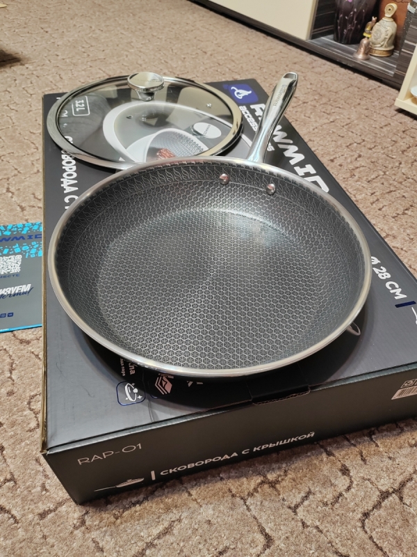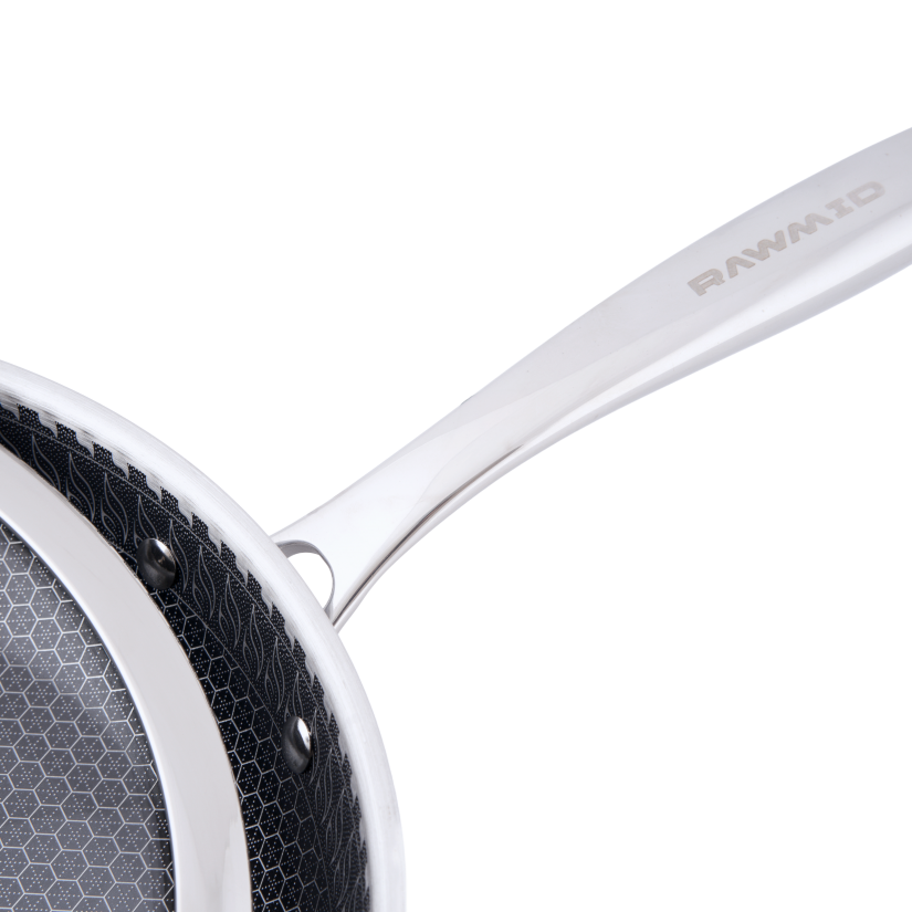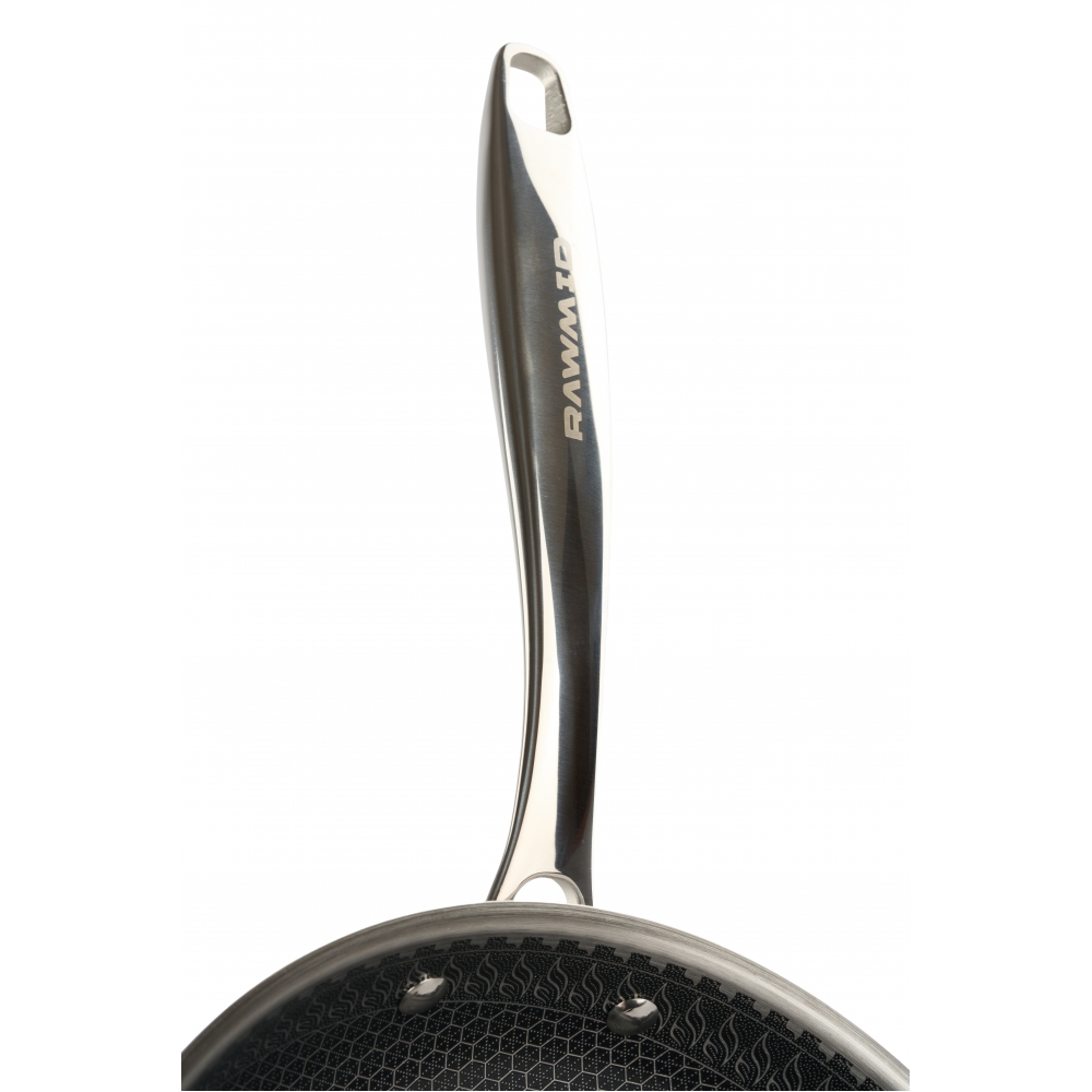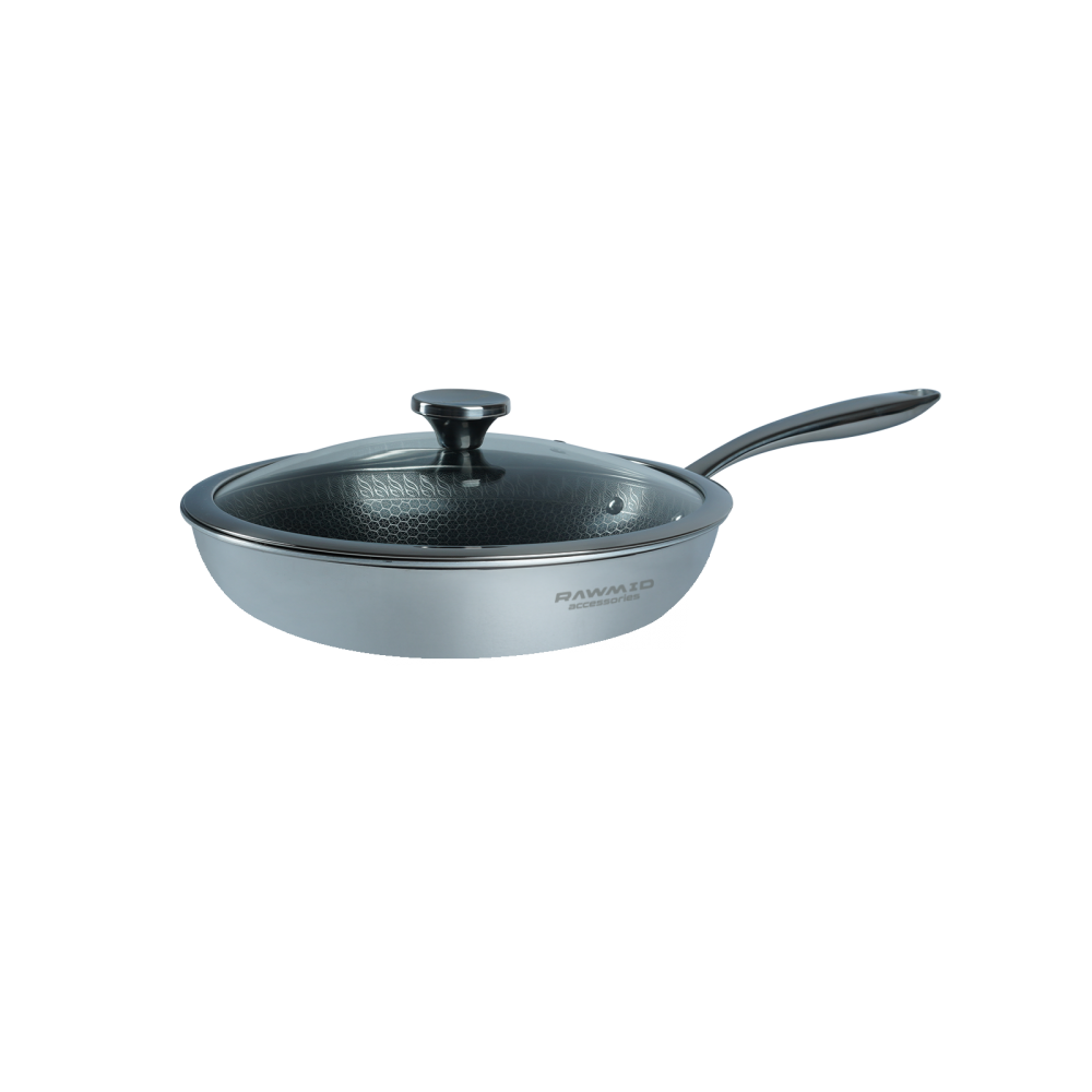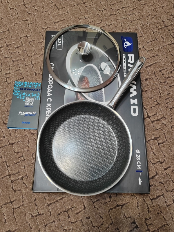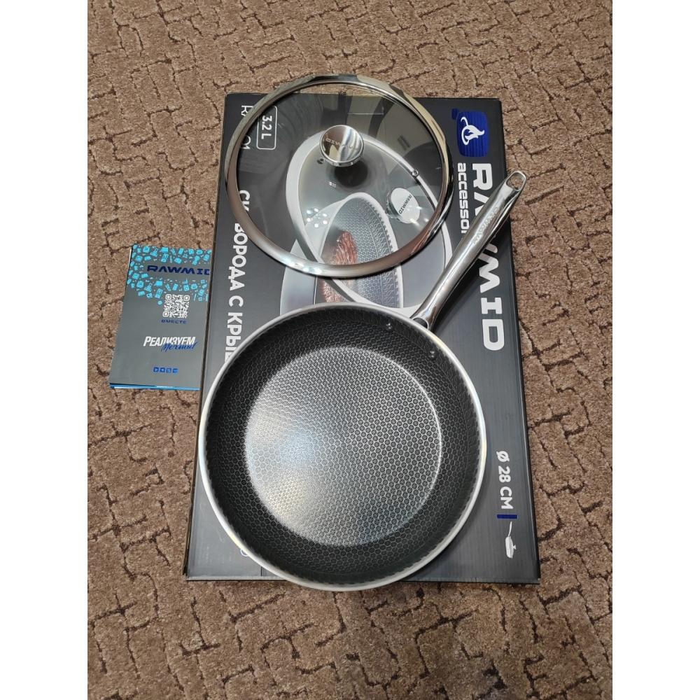 RAWMID RAP-01 — универсальная сковорода с крышкой из трёхслойной стали и керамическим антипригарным покрытием Whitford FUSION. Внутренняя поверхность усилена технологией Honeycomb, которая повышает износостойкость и защищает покрытие от царапин. Трёхслойный корпус с алюминиевым сердечником обеспечивает быстрый и ровный нагрев без горячих точек, что делает сковороду удобной как для жарки, так и для тушения или запекания.
