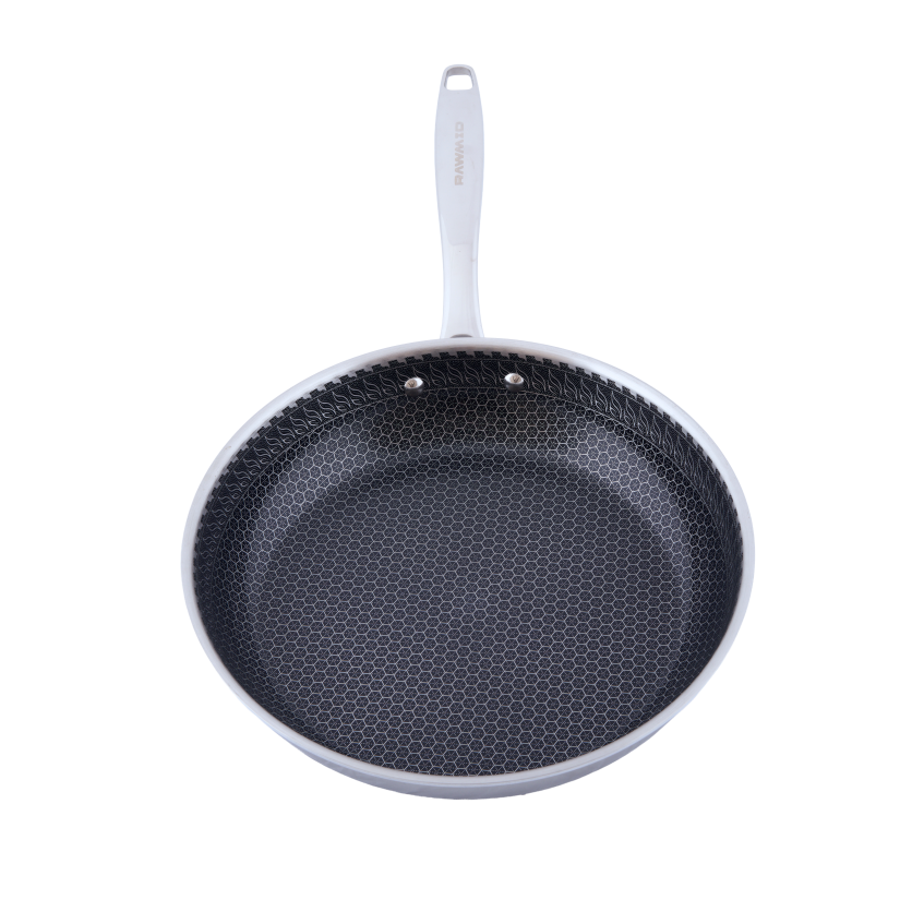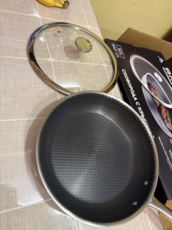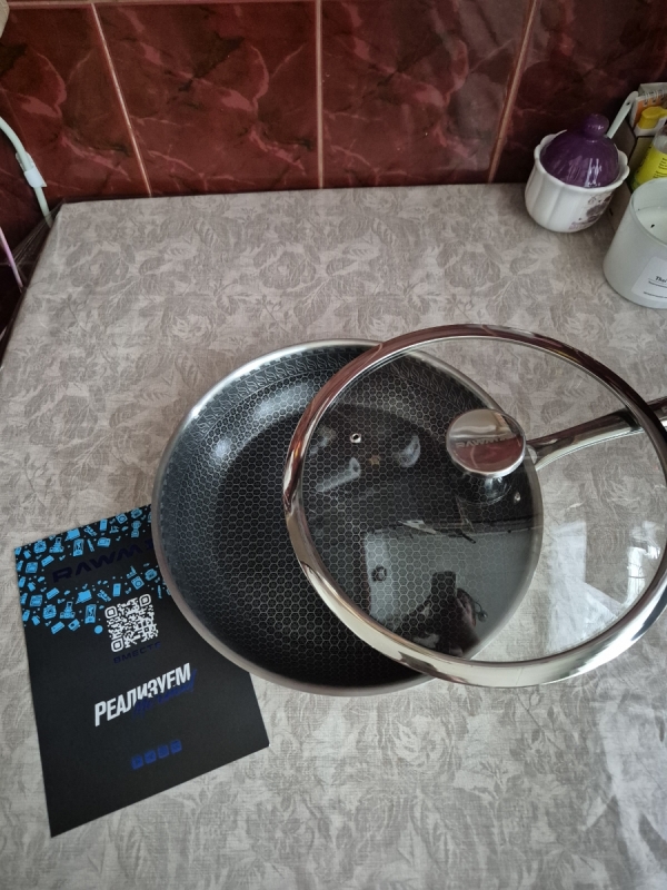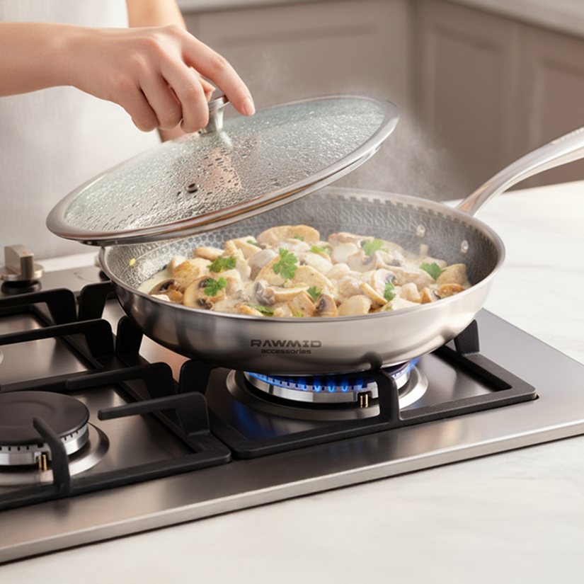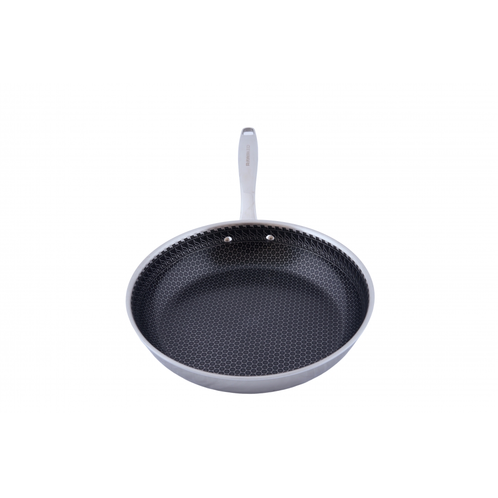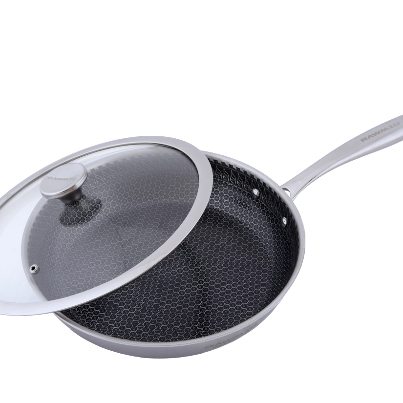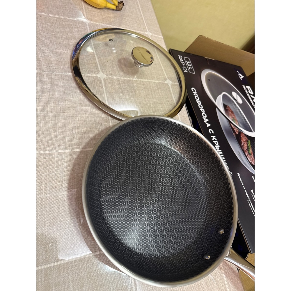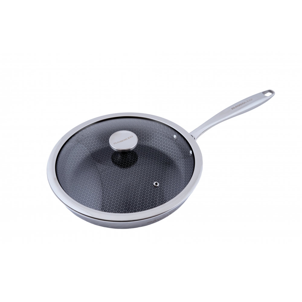 RAWMID RAP-01 — универсальная сковорода с крышкой из трёхслойной стали и керамическим антипригарным покрытием Whitford FUSION. Внутренняя поверхность усилена технологией Honeycomb, которая повышает износостойкость и защищает покрытие от царапин. Трёхслойный корпус с алюминиевым сердечником обеспечивает быстрый и ровный нагрев без горячих точек, что делает сковороду удобной как для жарки, так и для тушения или запекания.