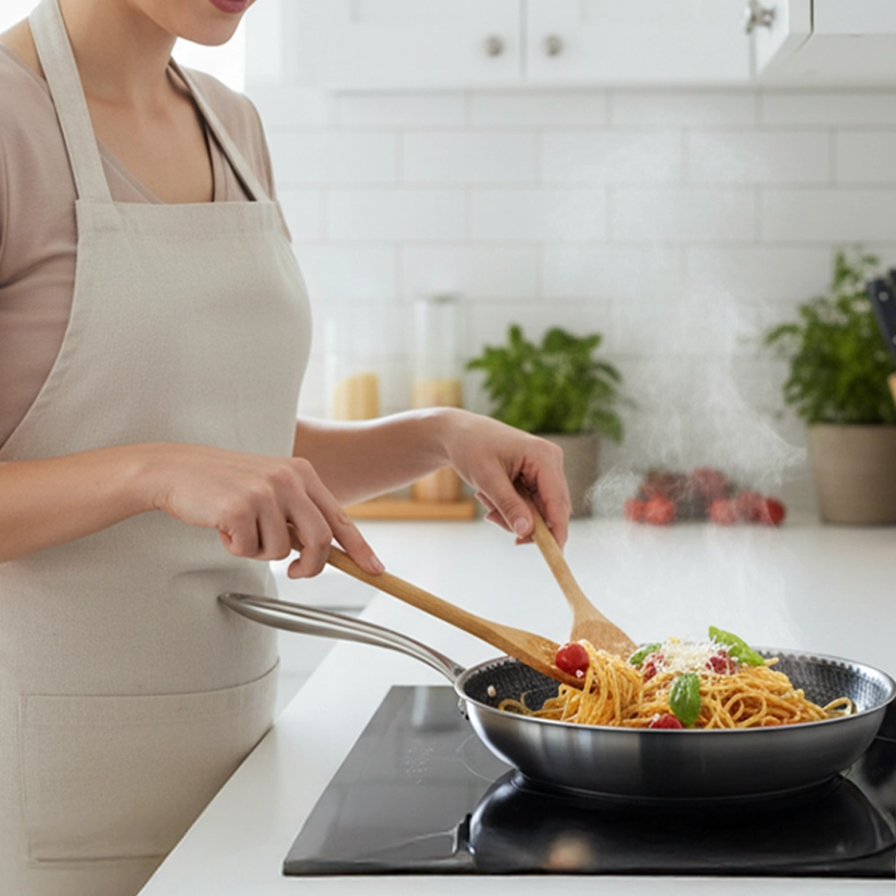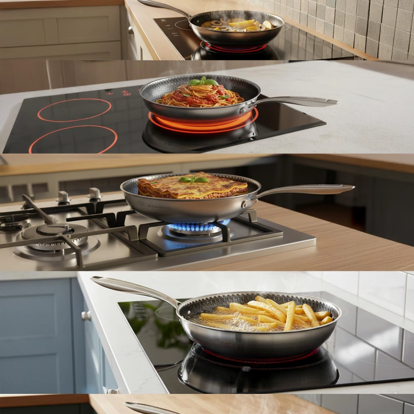 Сковорода выдерживает нагрев до 280°C и подходит для всех типов плит, включая индукцию, а крышка из закалённого стекла (до 220°C) позволяет использовать RAP-01 и в духовке. Керамическое покрытие безопасно, не содержит PFAS, PTFE, PFOA и тяжёлых металлов, а материалы корпуса остаются инертными при высоких температурах. Благодаря объёму 3,2 литра и диаметру 28 см сковорода подходит для повседневной готовки, блюд на семью и рецептов, требующих равномерного прогрева по всей поверхности.