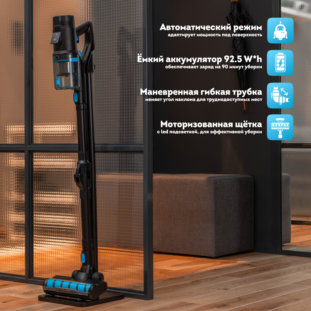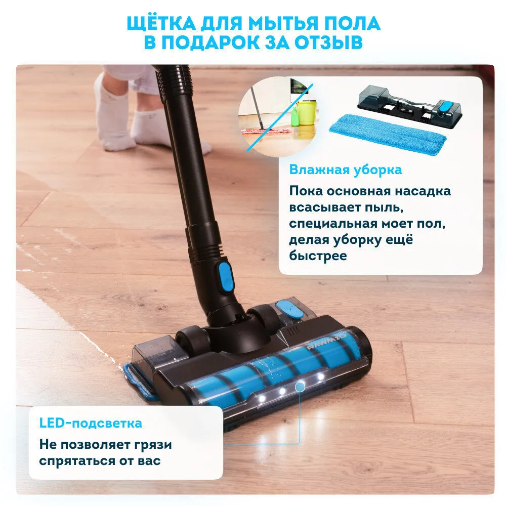 Благодаря LED-подсветке на щётке, мусор не спрячется в тёмных углах под мебелью, а прибраться во всём помещении можно даже в условиях слабой освещённости.