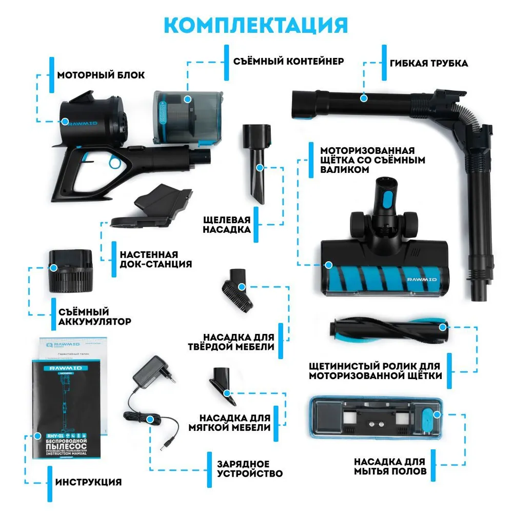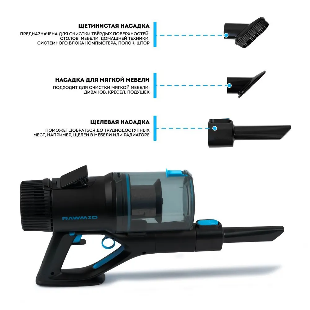 Пылесос RAWMID можно поставить на хранение и зарядку в любом удобном месте, для этого даже не потребуется устанавливать настенную или напольную док-станцию. Шнур питания в таком случае подключается напрямую к аккумулятору.