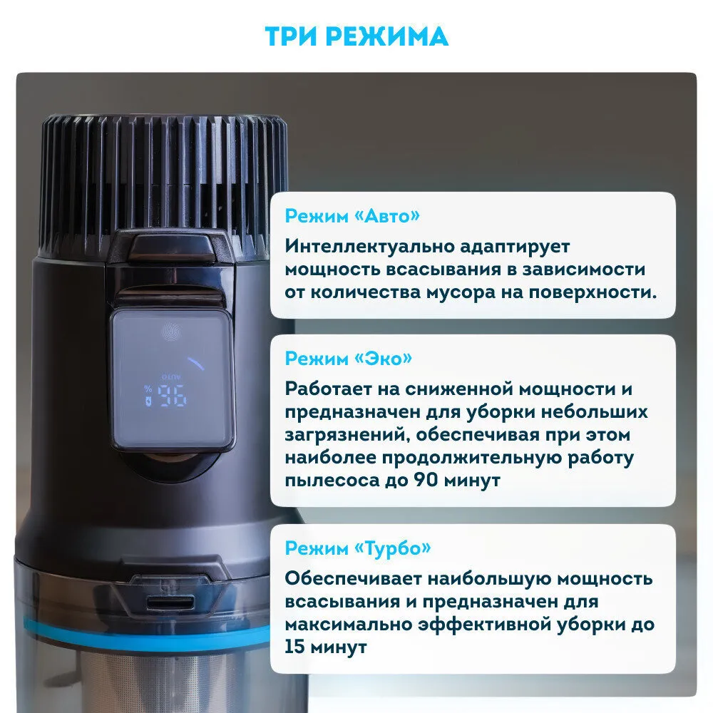 Режим «Турбо» обеспечивает наибольшую мощность всасывания и предназначен для максимально эффективной уборки до 15 минут.