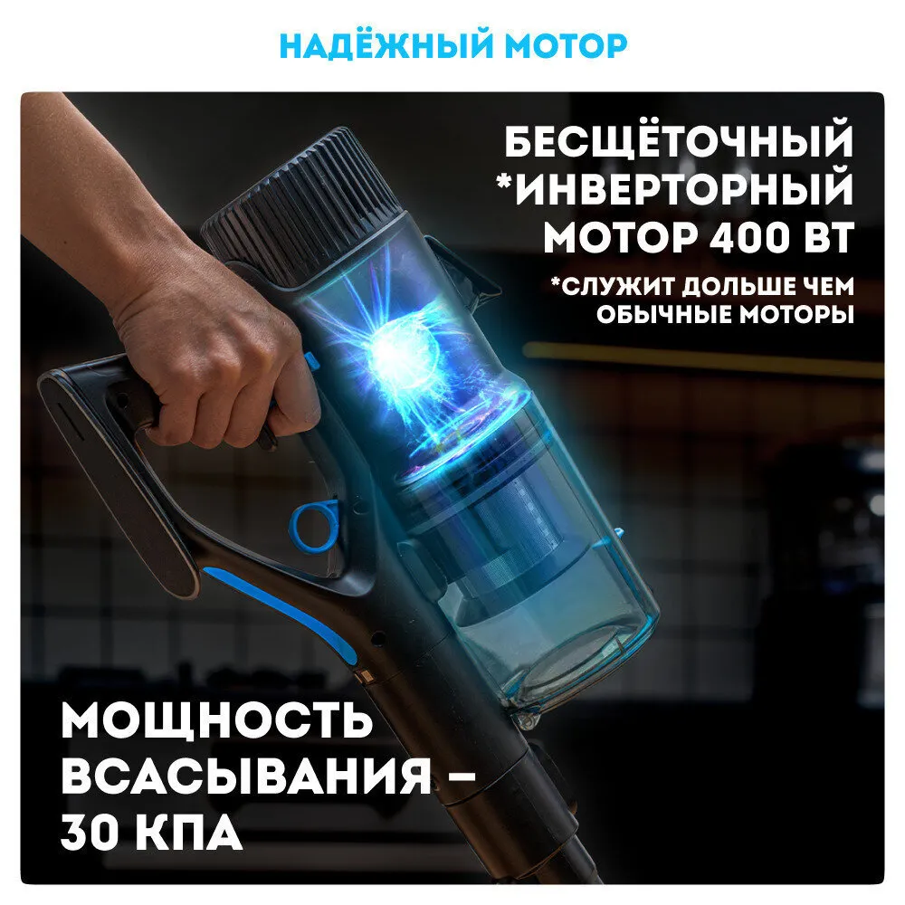 Пылесос RAWMID Modern оснащён высоконадёжным мотором, обладающим мощностью 400 Вт. Бесщёточный мотор инверторного типа обладает более высокой надёжностью и более длительным сроком службы, по сравнению с обычными моторами, Также бесщёточные инверторные моторы обладают более высоким КПД и меньшим шумом.