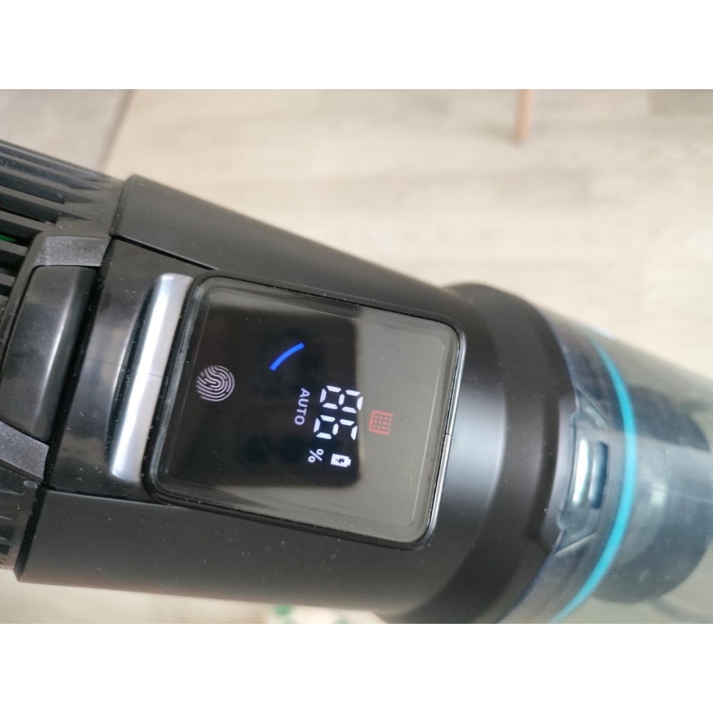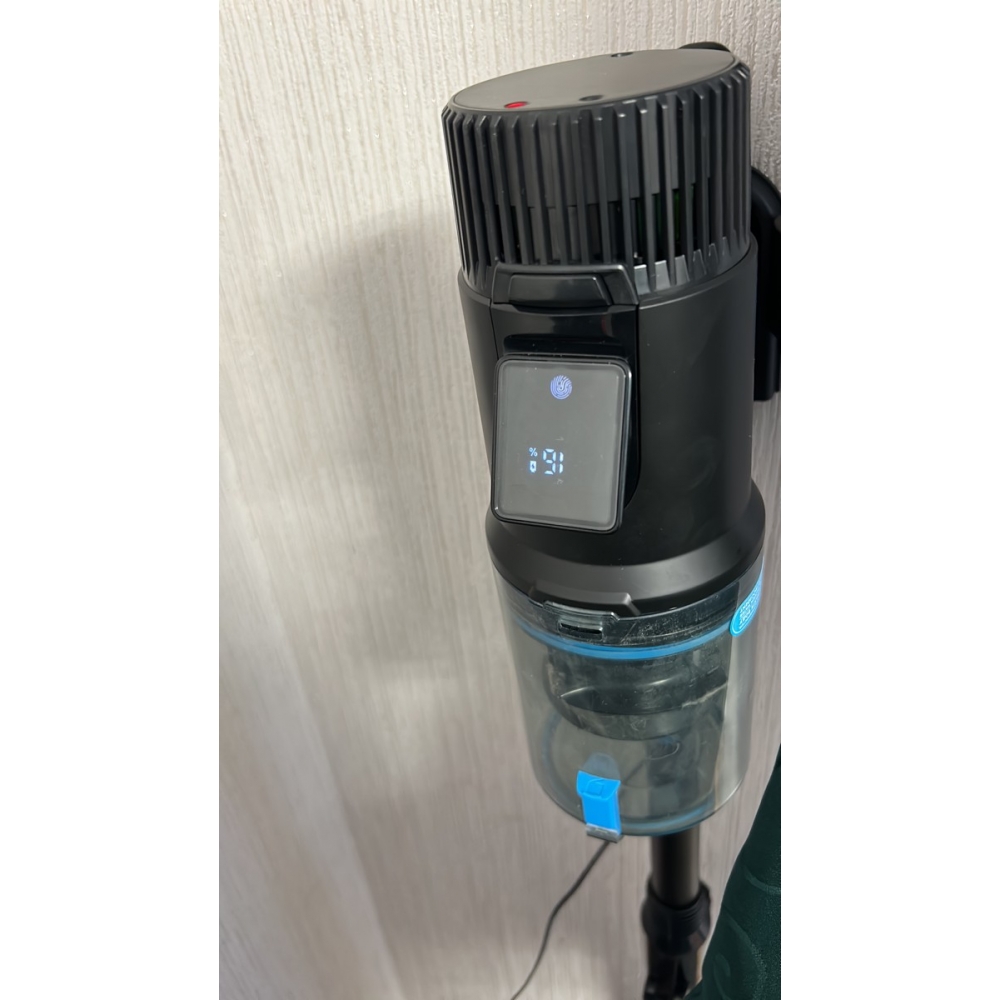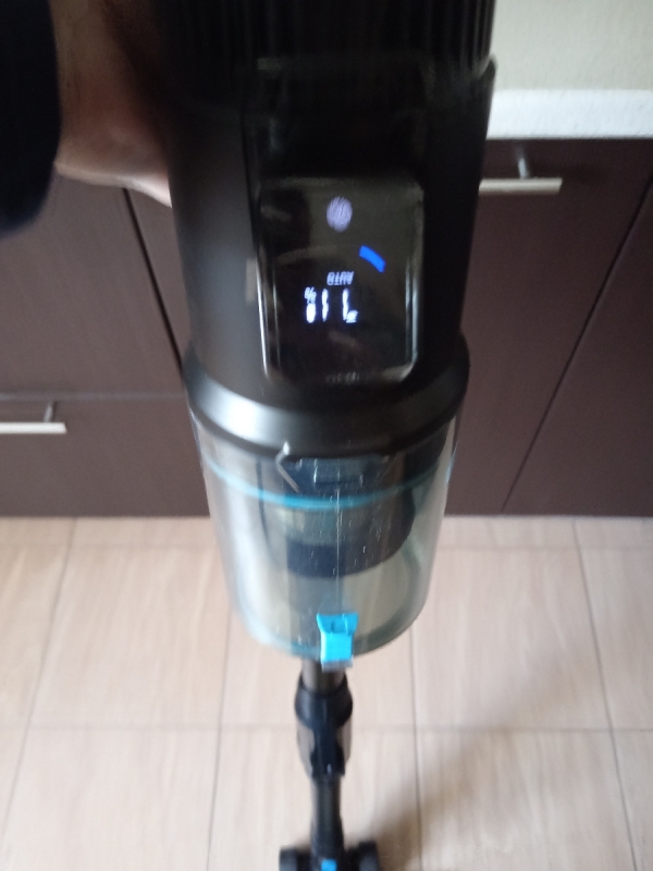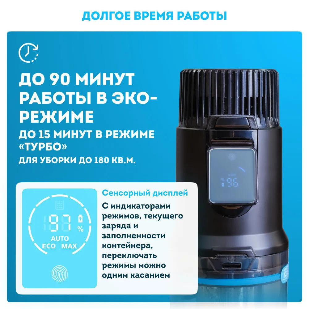 На дисплее во время работы пылесоса отображается оставшийся заряд аккумулятора и текущий режим работы. Переключать режим можно с помощью касания сенсорной кнопки. А специальный индикатор красного цвета подскажет Вам, когда настанет пора очистить контейнер.