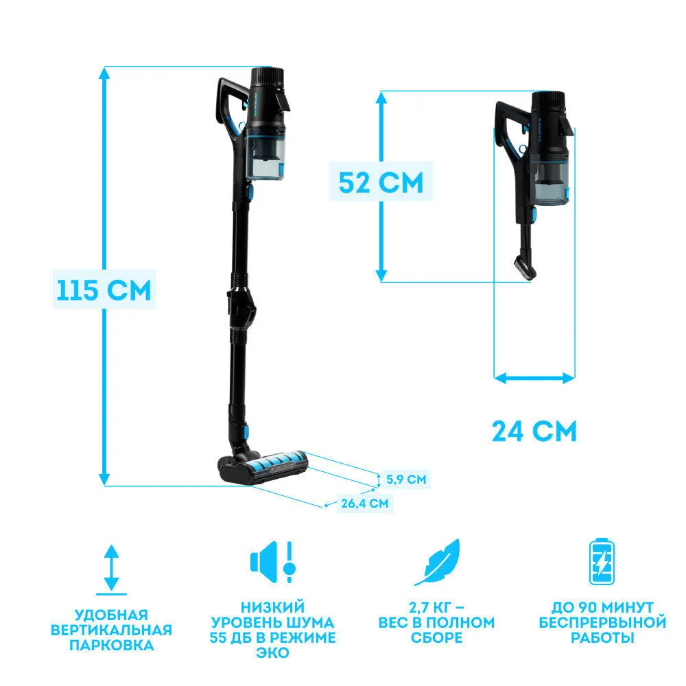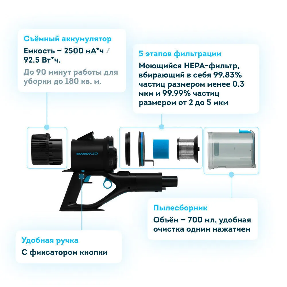 Аккумулятор пылесоса RAWMID Modern обладает высокой энергоёмкостью 92.5 ватт-час и обеспечивает до 90 минут работы в режиме «Эко» и до 15 минут в режиме «Турбо».