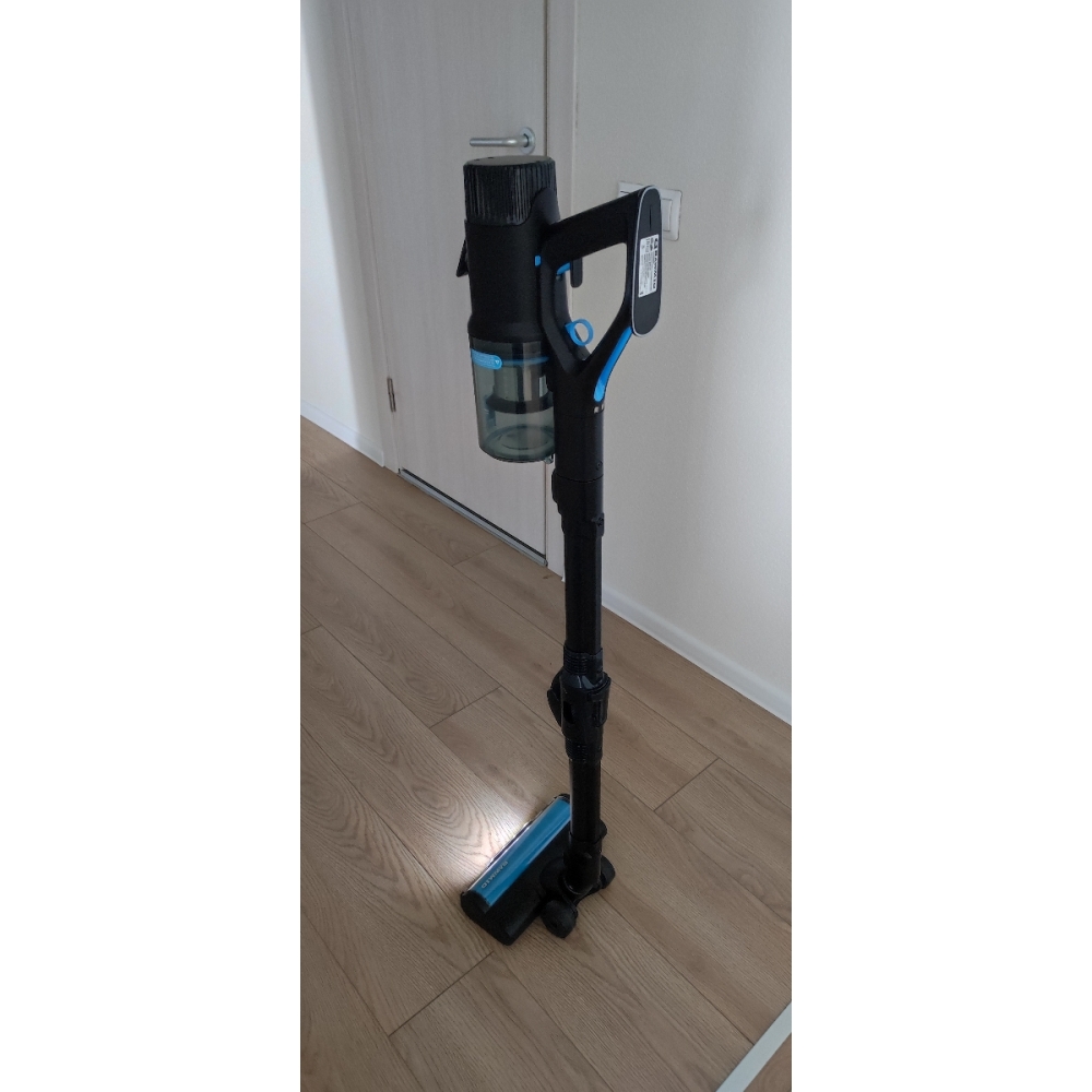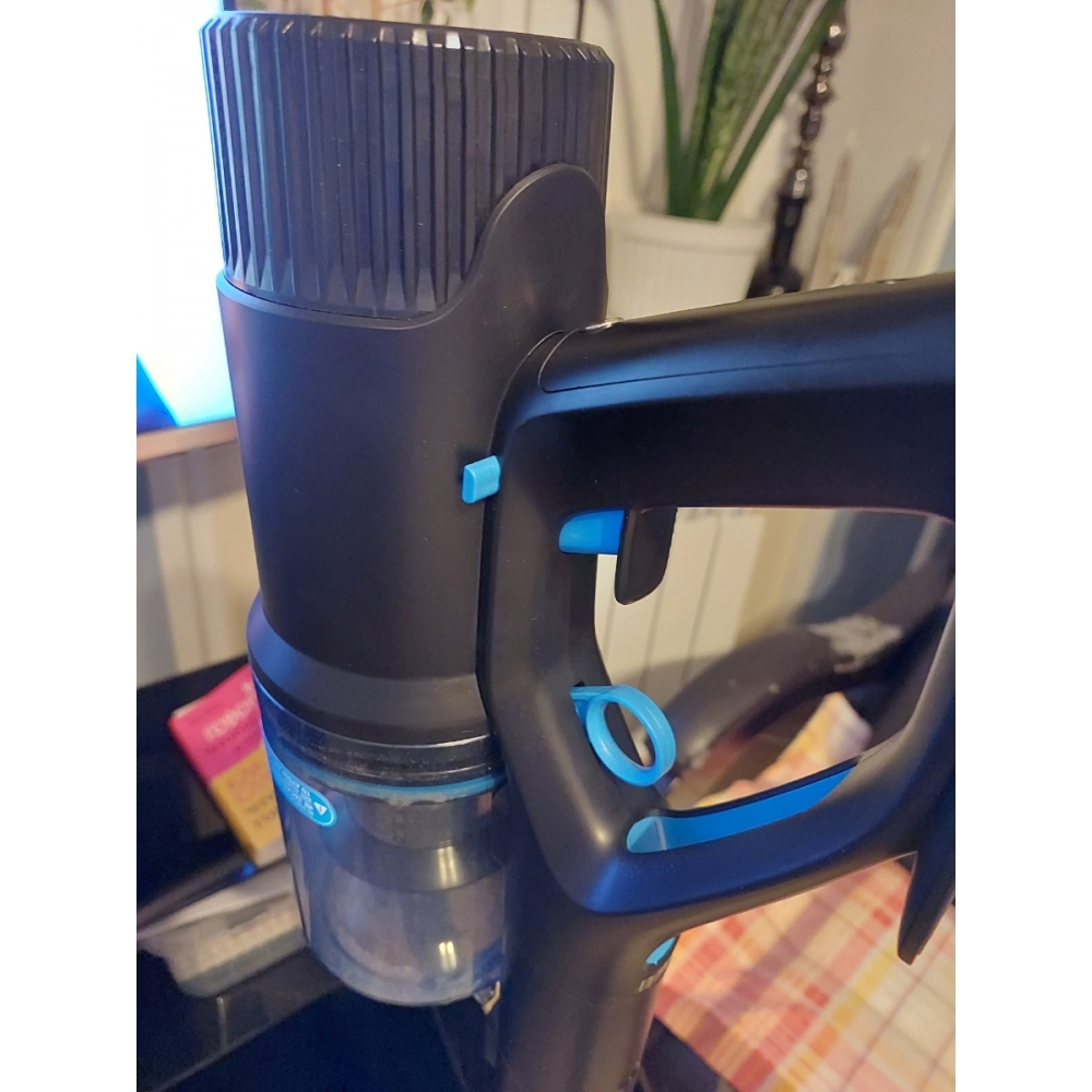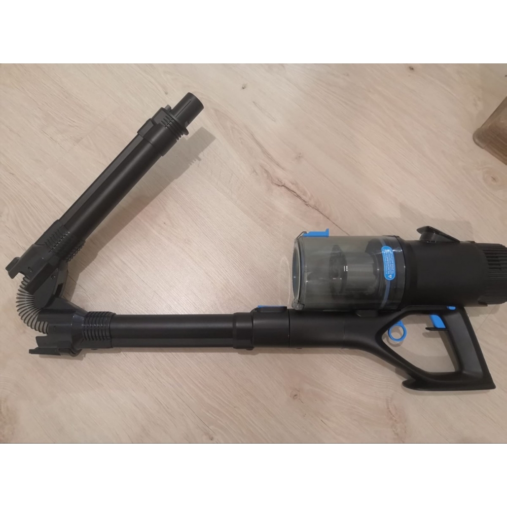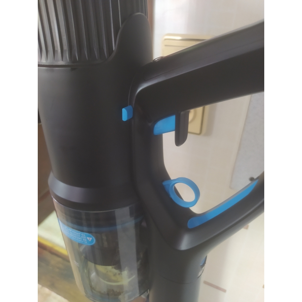 Блок с мотором и контейнером для мусора расположен вдоль корпуса, за счёт чего пылесос легче ощущается в руке и делает процесс уборки ещё более лёгким и приятным. Также такой форм-фактор защищает от высыпания мусора из контейнера при вертикальной установке пылесоса.