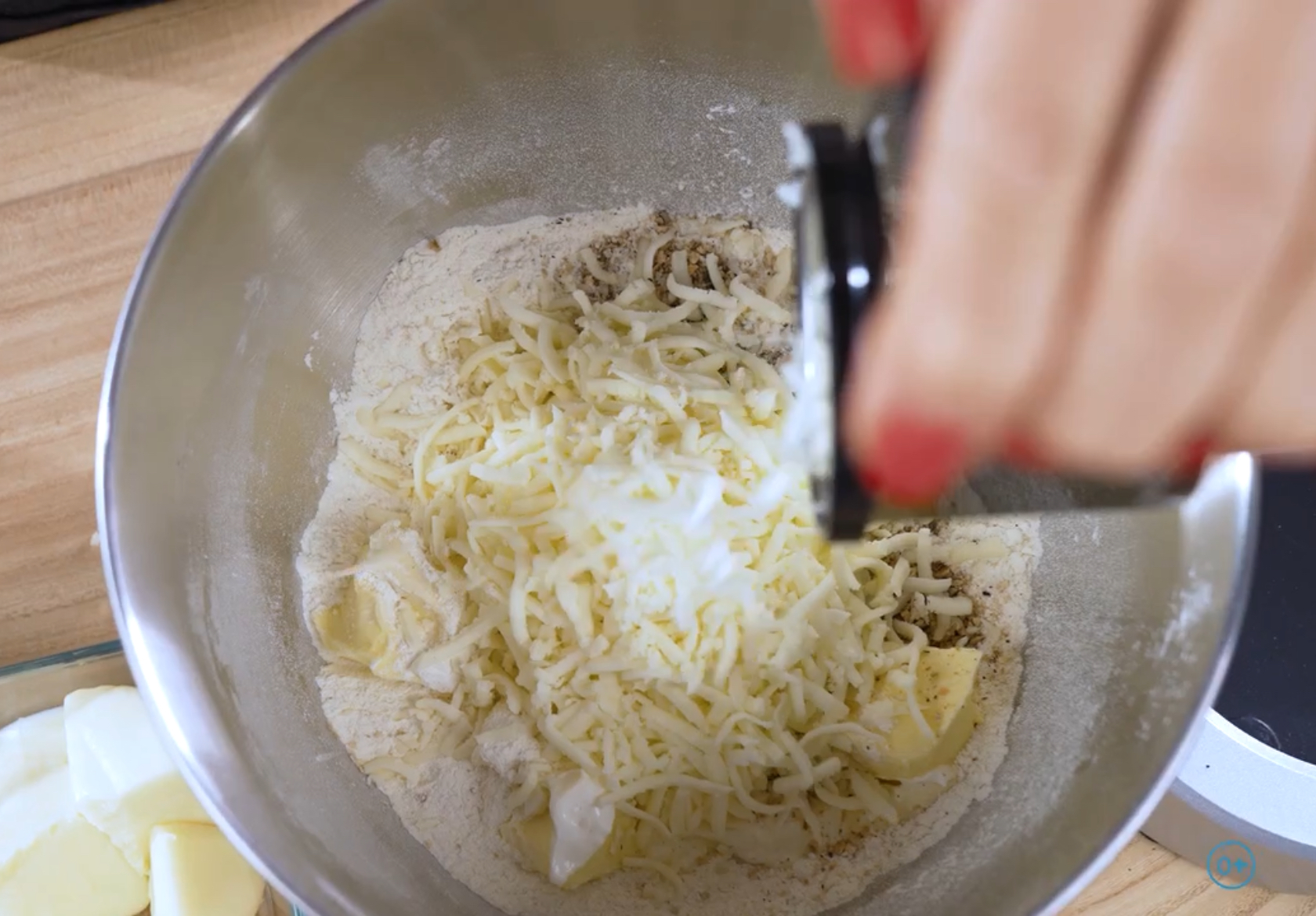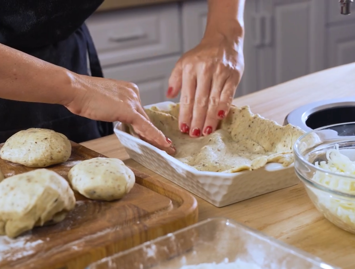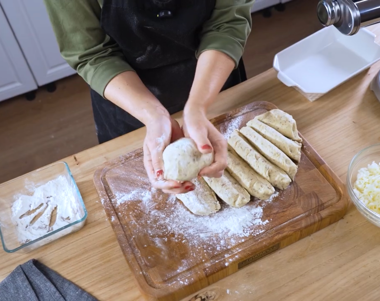 4. Натрите 150 г сулугуни прямо в тесто и замесите до однородной массы.