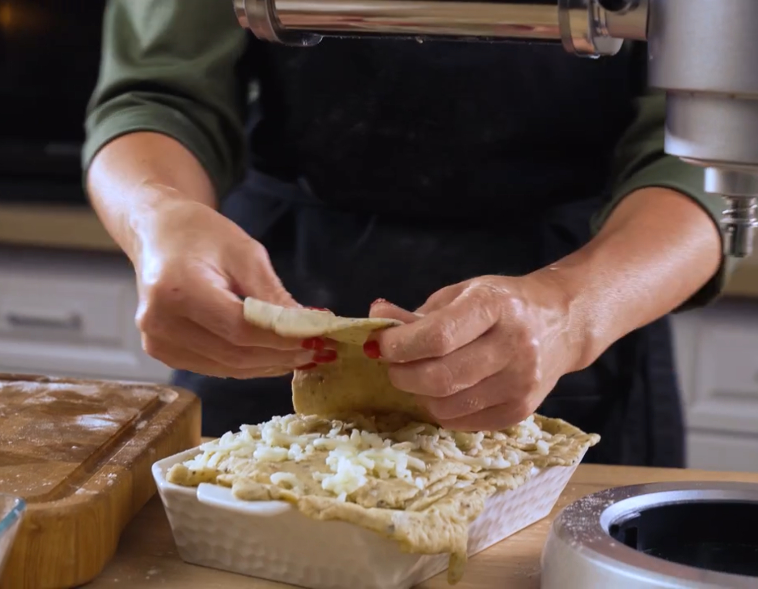 1. Выложите основу в форму и посыпьте слой тертым сулугуни. Повторяйте процесс с каждым слоем, кроме последнего.