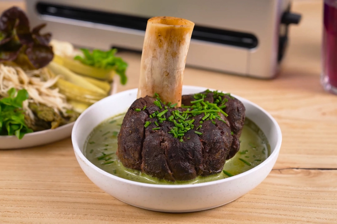 Говяжья голень, приготовленная по технике су-вид – это изысканное блюдо, которое сочетает насыщенный вкус маринада из красного вина, соевого соуса, чеснока и трав с нежной текстурой томленого мяса. Гарнир из брокколи, цветной капусты, спаржи, лука-порея и грибов-эноки, приготовленных в сливочном масле с тимьяном, сохраняет хрустящую структуру и естественный вкус. Завершающий штрих – соус на основе ароматного масла, яичных желтков и горчицы. Это блюдо идеально для праздничного ужина.