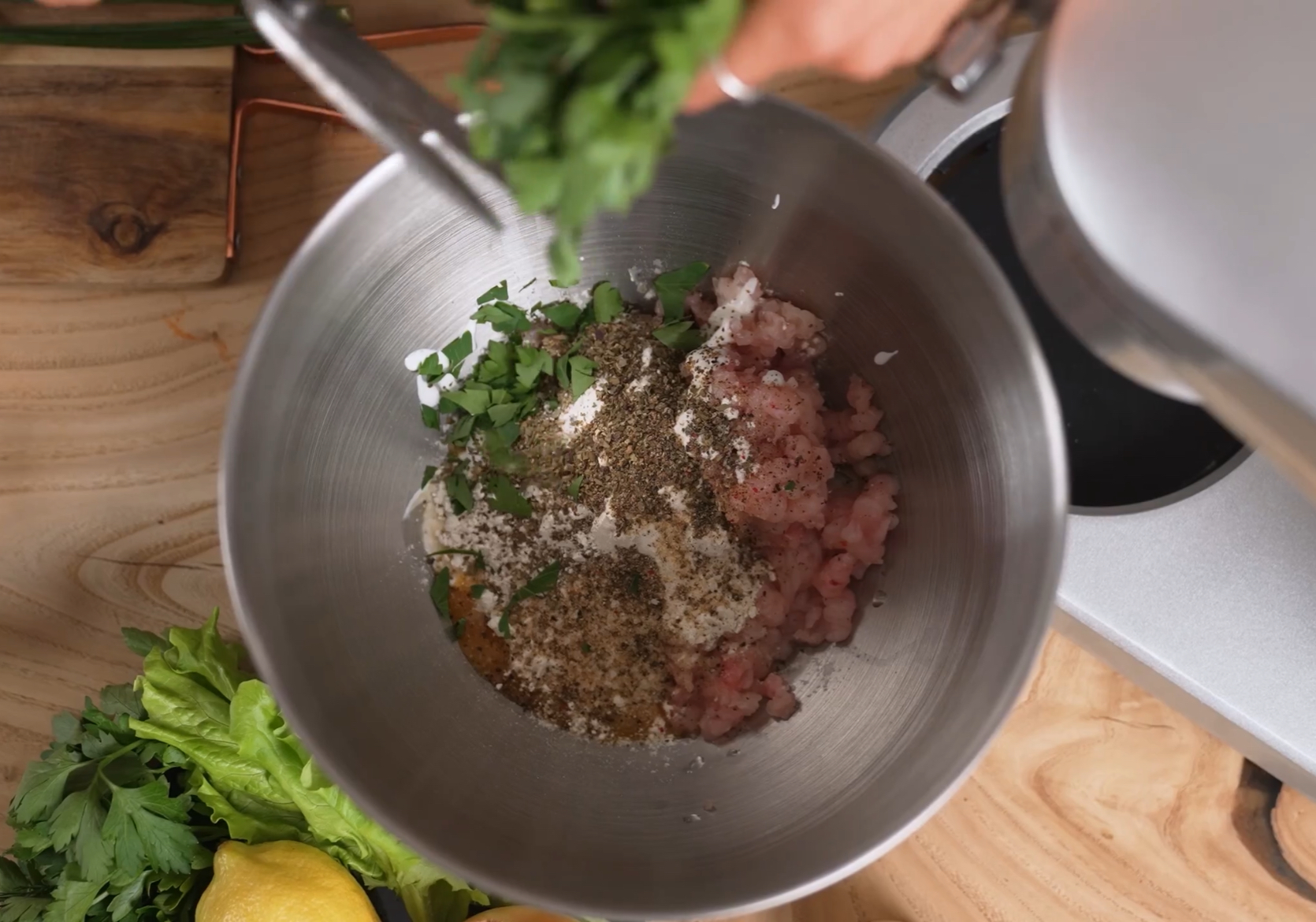2. Добавьте: 1 яйцо, 2 ст. л. сметаны, 2 ст. л. муки, 1 ч. л. соли, сушеный чеснок, базилик, смесь перцев, зелень и цедру лимона. Перемешайте.