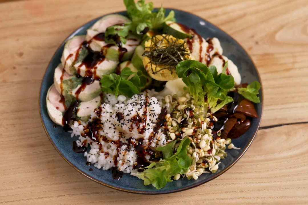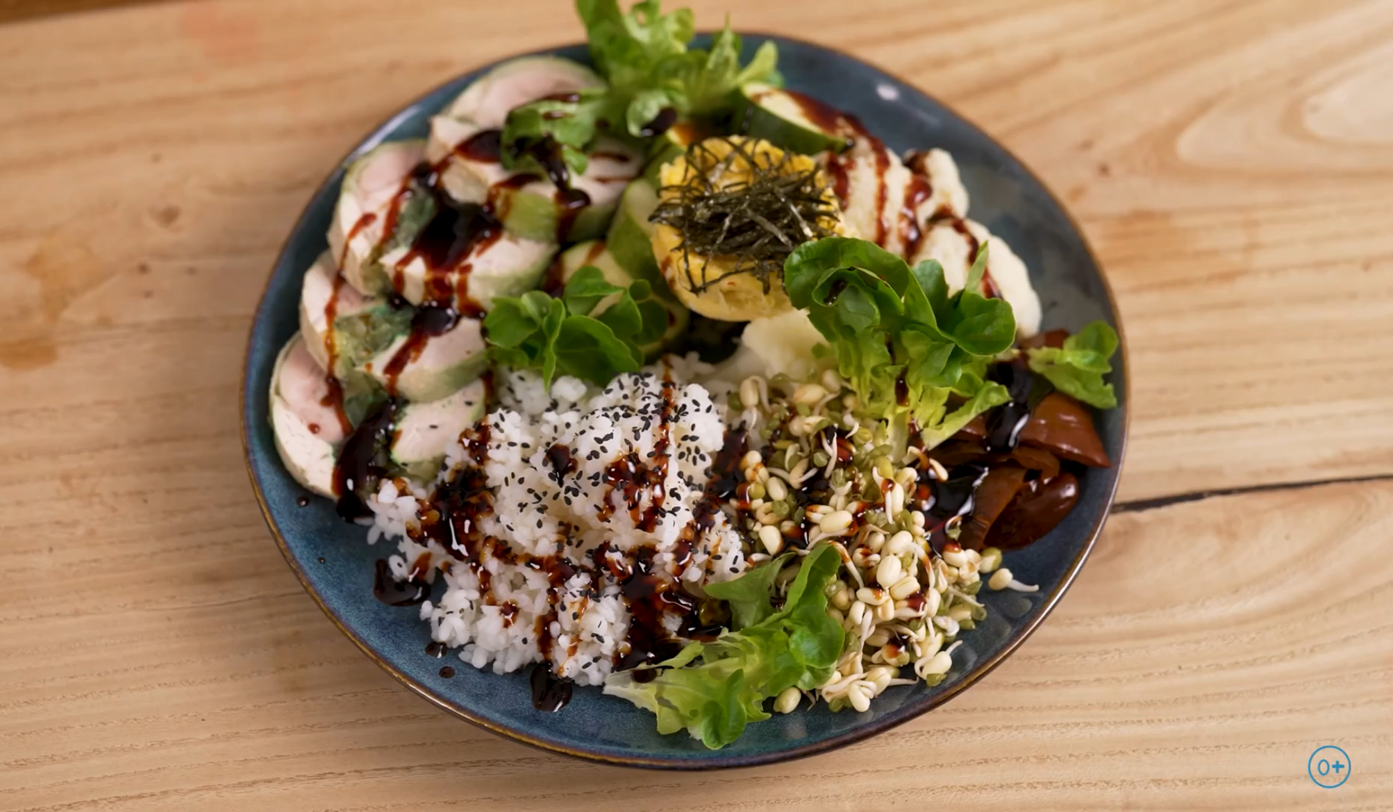 Блюдо представляет собой нежный куриный рулет с водорослями чука, стабилизированный желатином и приготовленный на пару. Гарнир состоит из японского риса, приготовленного на пару, парового омлета, овощей и соуса терияки. Блюдо отличается сочетанием свежих морских нот водорослей с мягкостью курицы и насыщенным вкусом азиатских заправок.