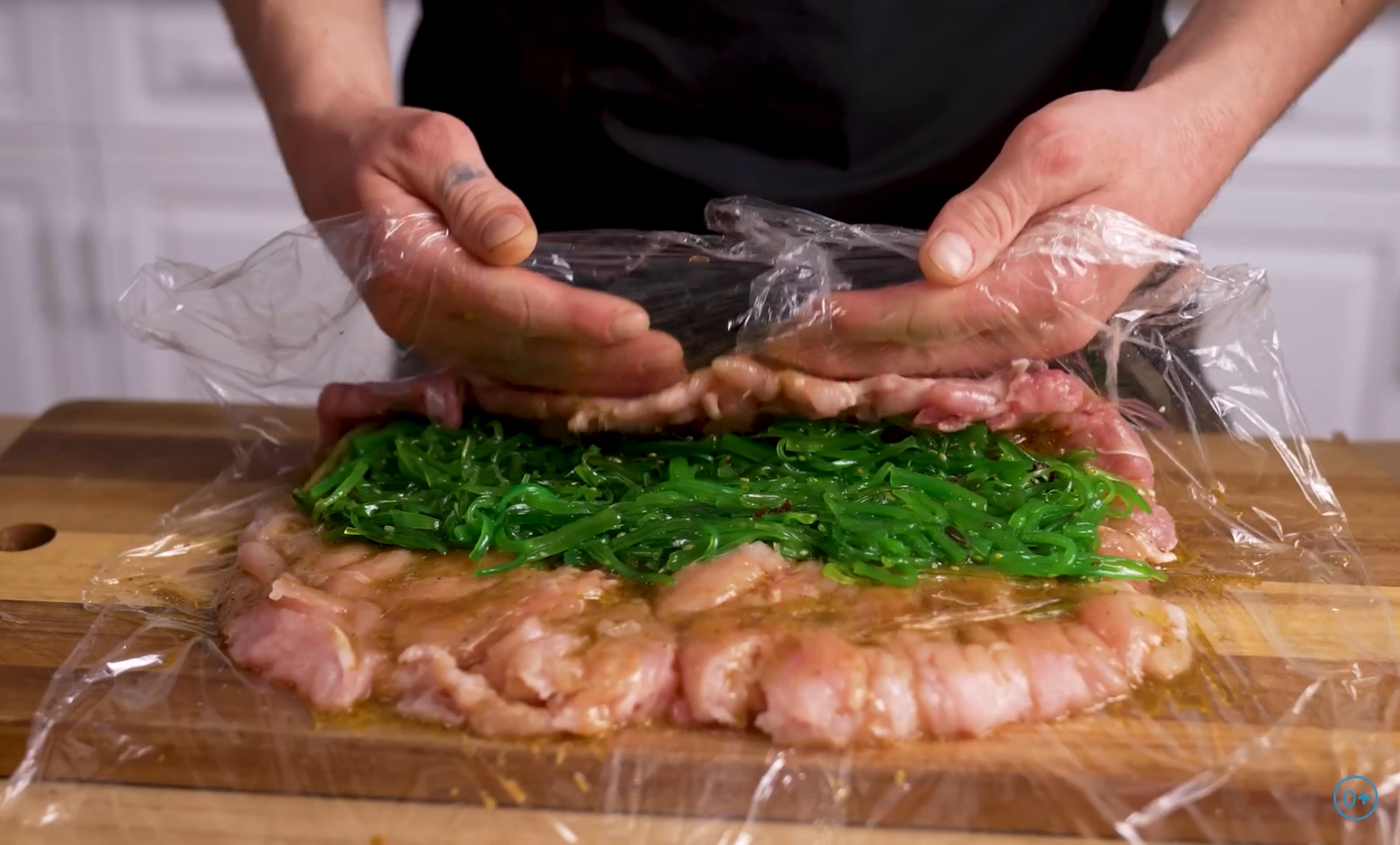 1. Выложите водоросли чука в центр филе, сверните рулетом и оберните пищевой пленкой.
