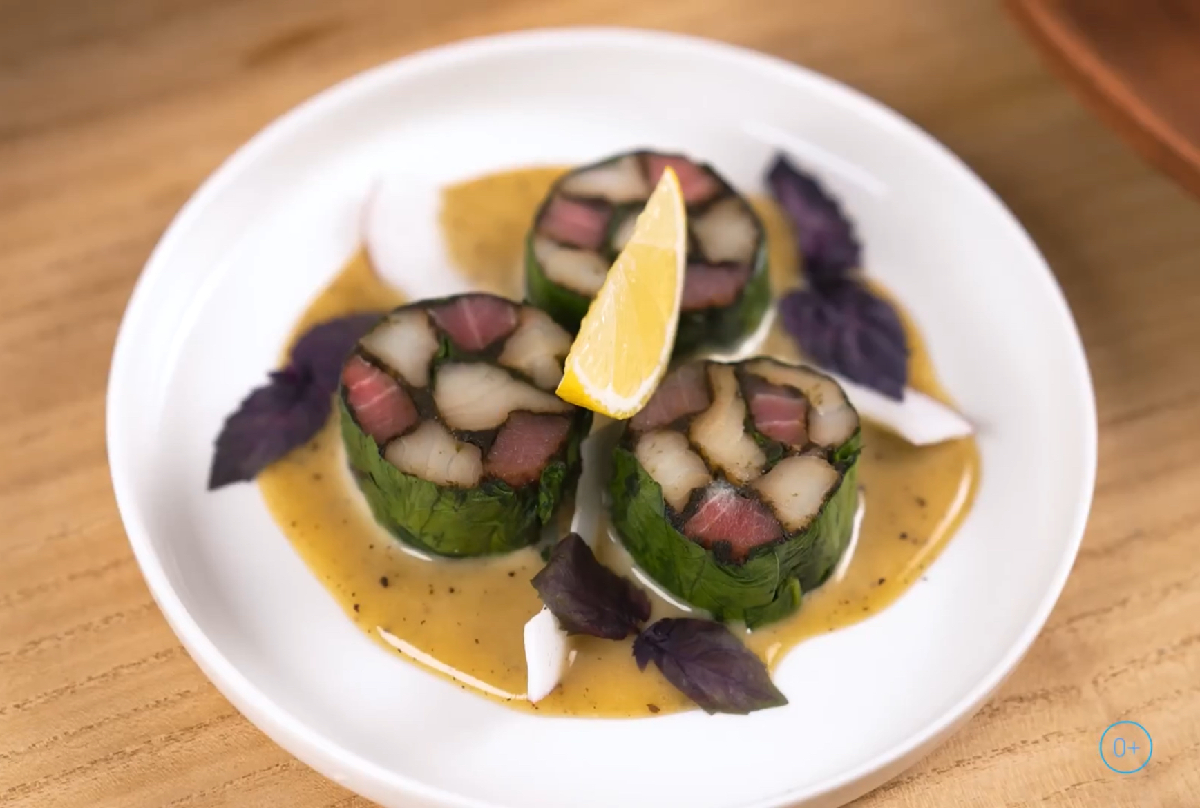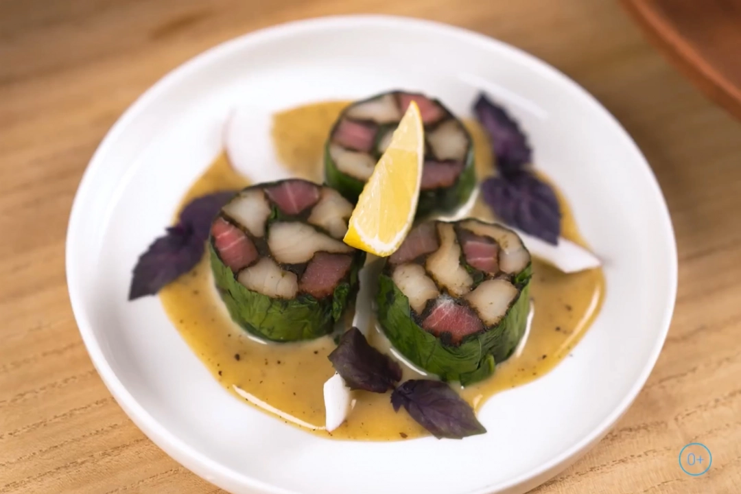 Мозаика из трески и тунца — это блюдо, в котором сочетаются два вида рыбы, нарезанные аккуратными брусочками и запанированные в пудре из водорослей нори. Рыбные кусочки выкладываются в мозаичном порядке на подложку из шпината, затем формируются в рулет и готовятся по технике су-вид. Подаётся с нежным соусом на основе жирных сливок, горчицы и мёда, создавая сбалансированный вкус с нотками пикантности и сладости.