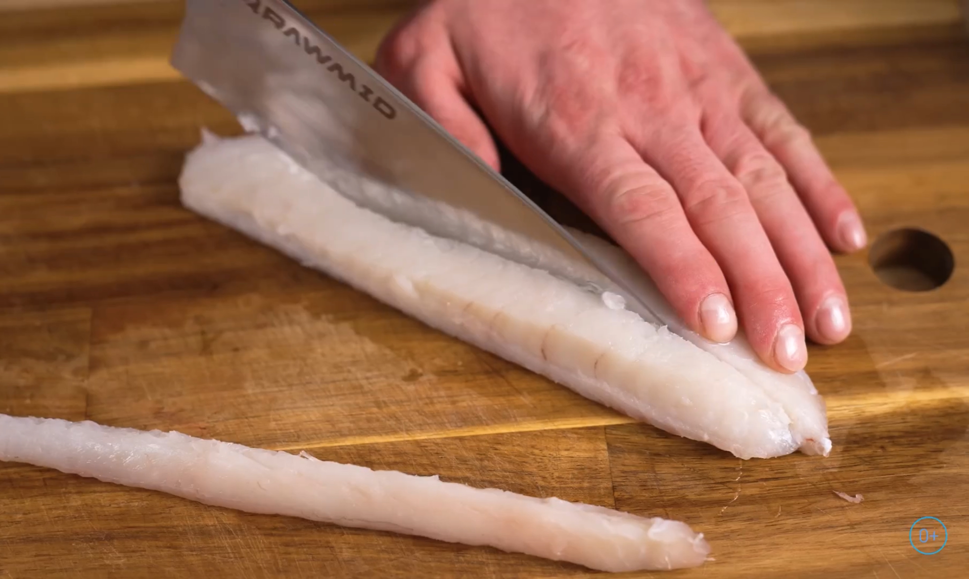 1. Нарежьте треску и тунец брусками толщиной 1,5 см.
