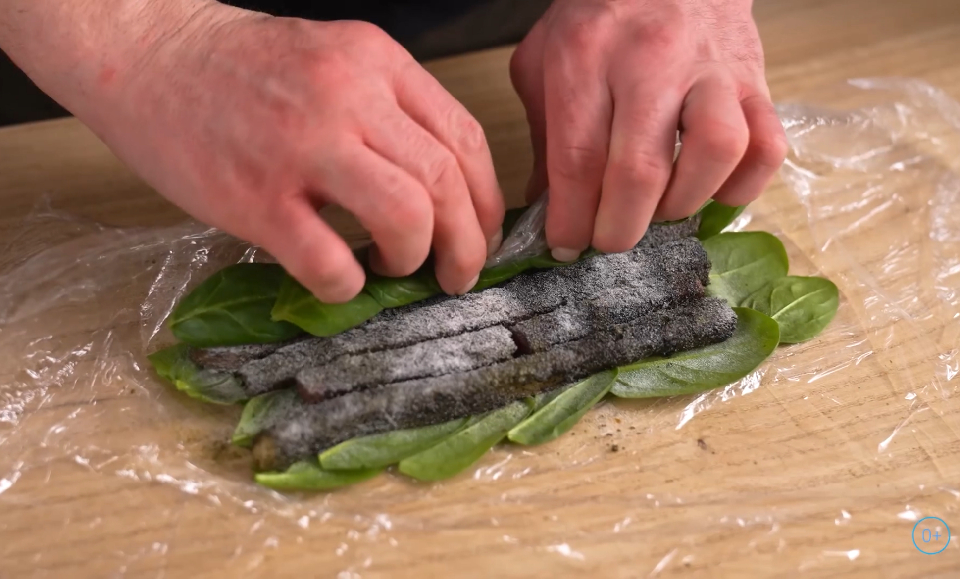 2. Присыпьте агар-агаром, сформируйте рулет и затяните в пленку.