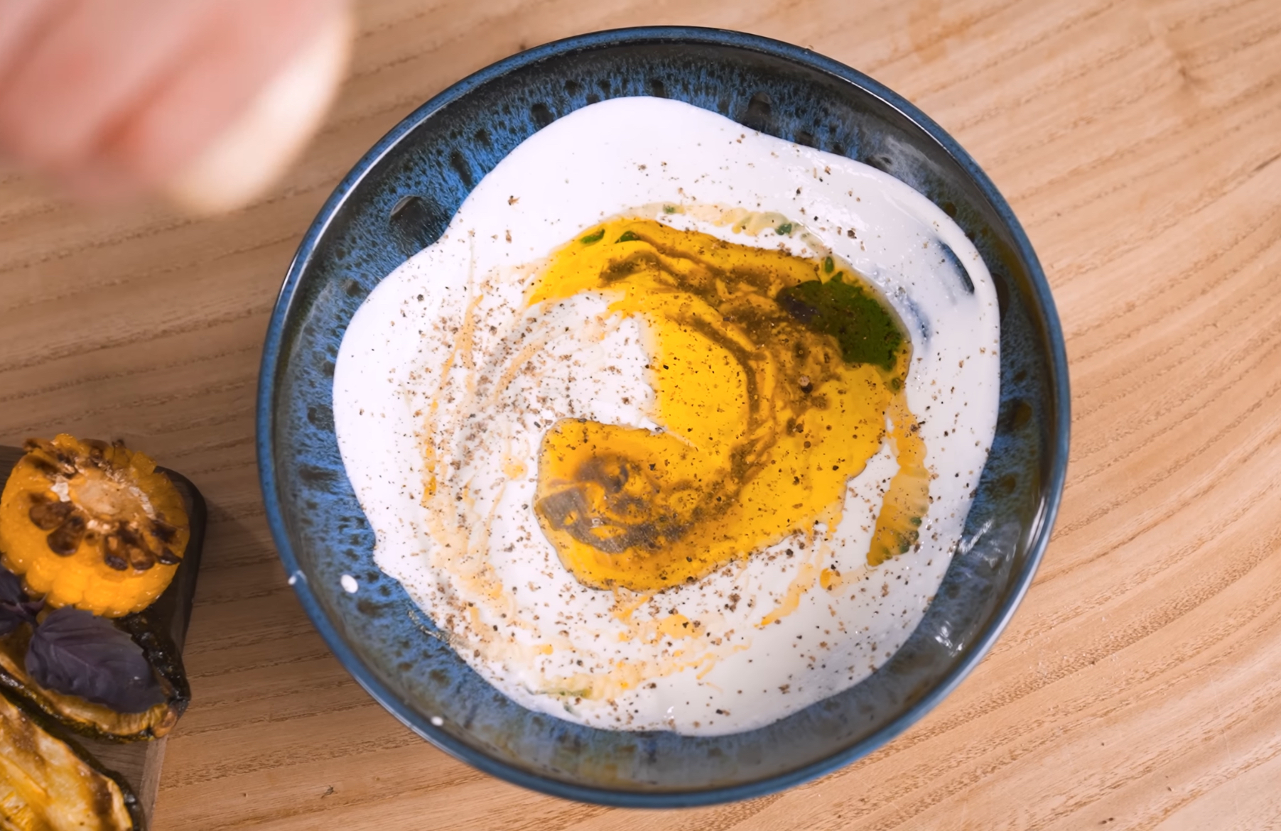 Смешайте греческий йогурт, мёд, оливковое масло и бальзамический уксус.