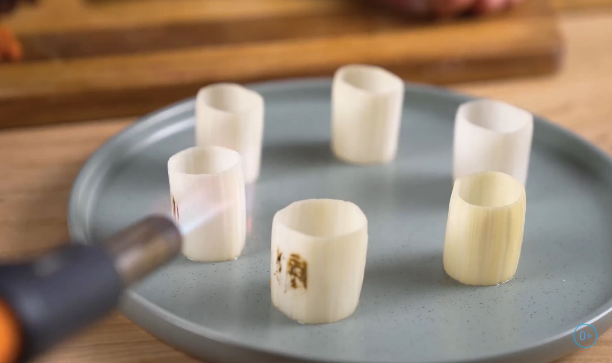1. Достаньте, разберите лук на каннеллони, обожгите горелкой.