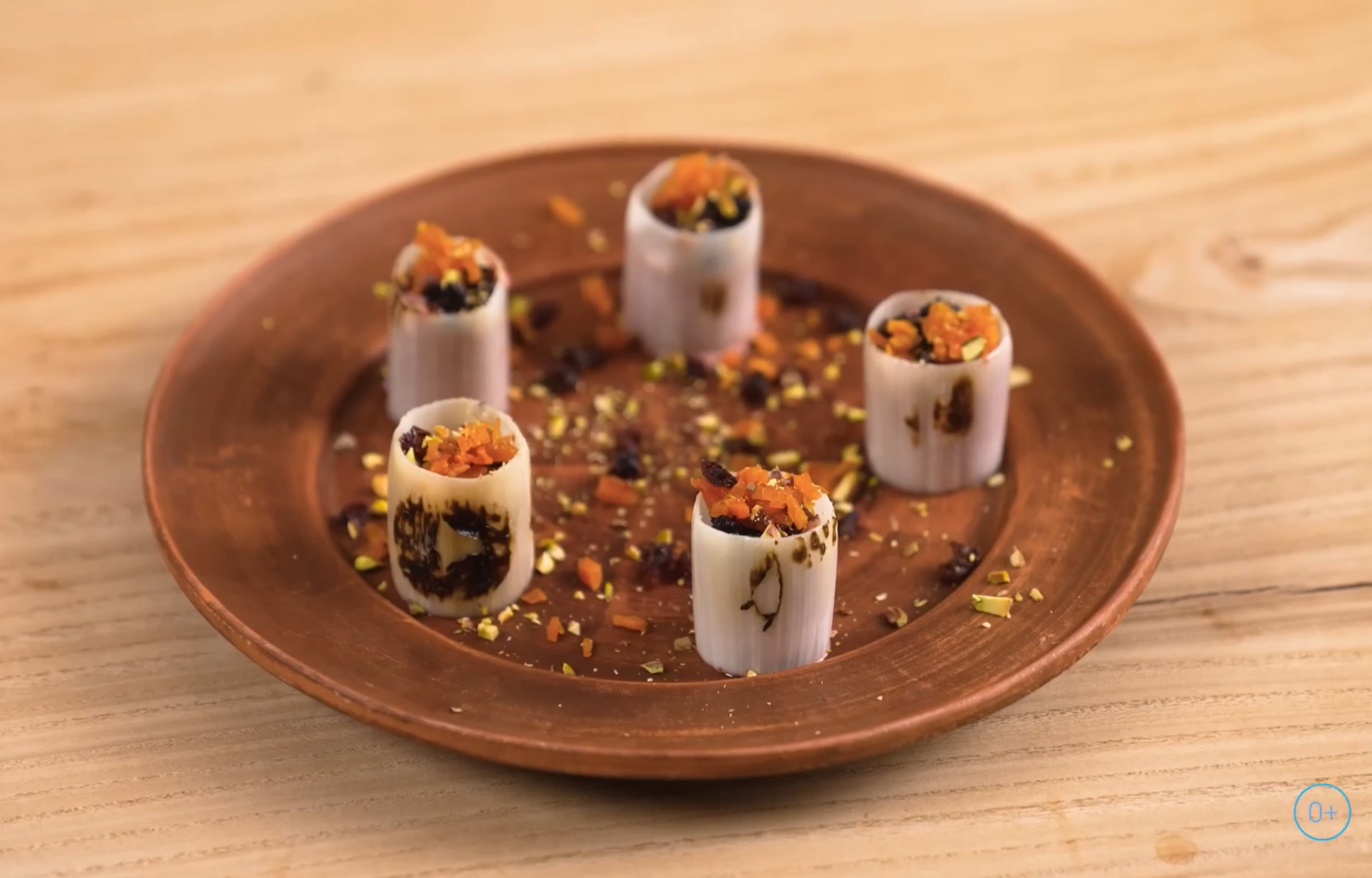 Паштет из куриной печени в каннеллони из лука-порея — это изысканная закуска, где нежный печеночный паштет сочетается с мягкими цилиндрами из томленого лука-порея. Блюдо дополнено панировкой из дроблёных фисташек, изюма и кураги, придающих текстуру и сладковатый оттенок. Лёгкий привкус карамелизированного лука и насыщенный вкус печени создают сбалансированное гастрономическое сочетание, идеально подходящее для праздничного стола.