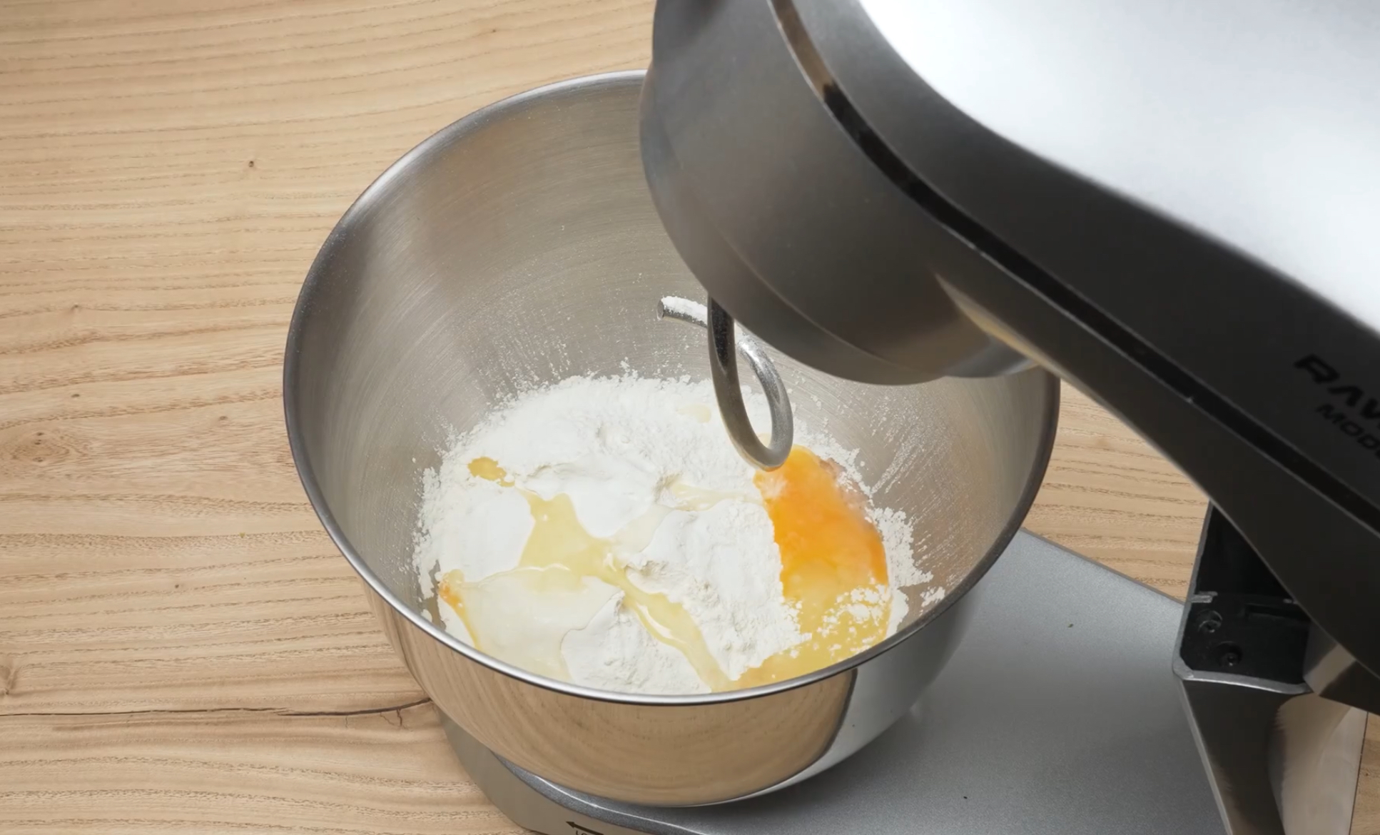 1. В чашу планетарного миксера добавьте 500 гр муки, 1 яйцо, 30 мл подсолнечного масла, 50 мл воды и щепотку соли.