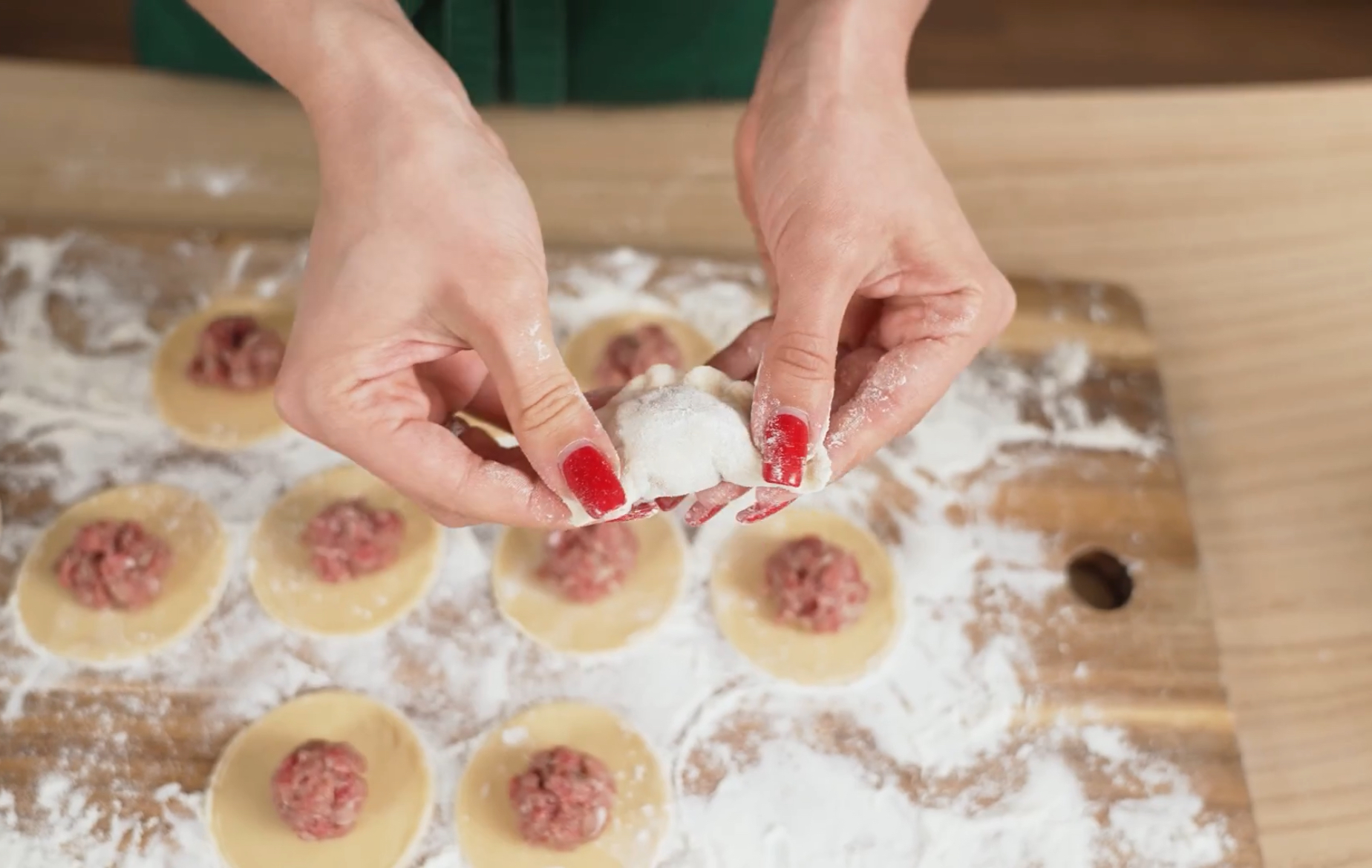 2. На каждый кружочек теста положите начинку. Защипните края, придавая форму «ушки».