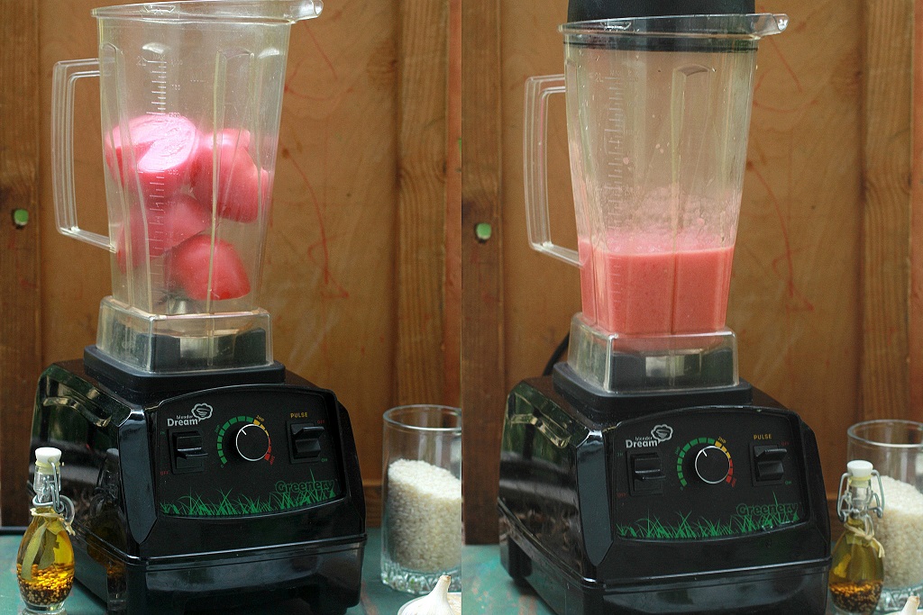 5. Томаты складываем в чашу блендера и пюрируем до однородности.