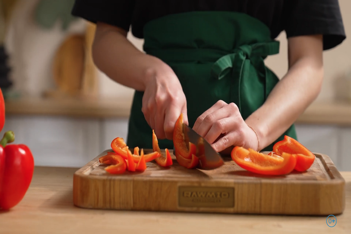 2. Болгарский перец разрезаем пополам, очищаем от семян и нарезаем соломкой длиной ~6 см.