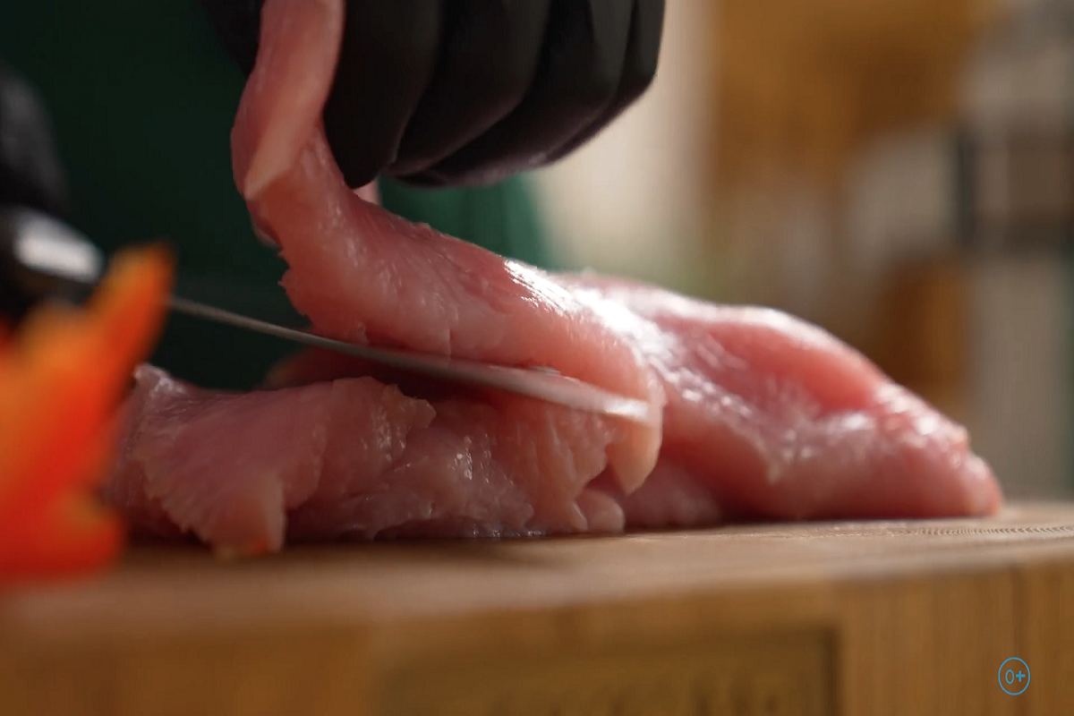 1. Нарезаем филе на длинные ломтики толщиной 5–7 мм (по длине ~10 см).