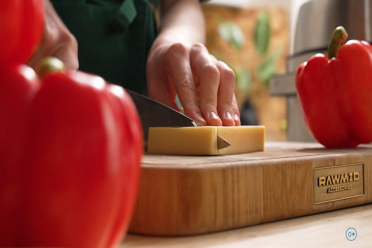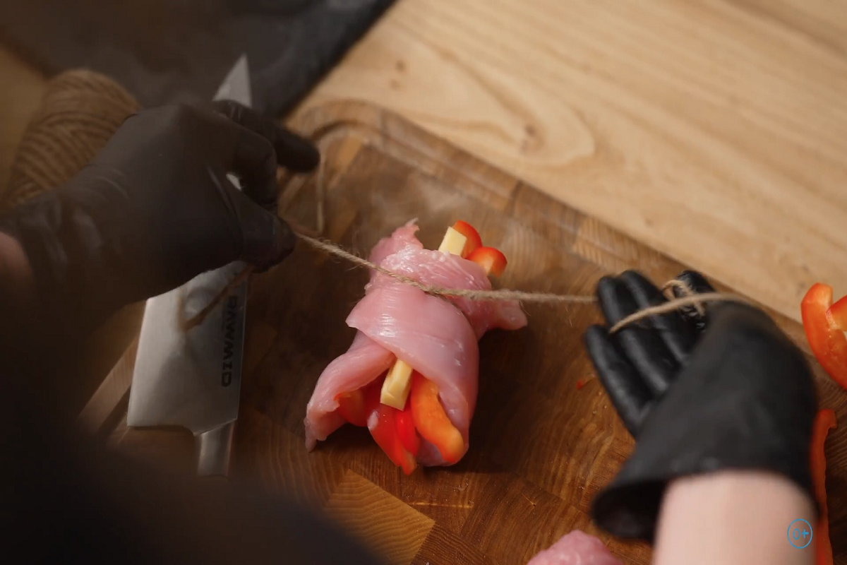 4. На индейку выкладываем перец и сыр, сворачиваем рулетом и перевязываем шпагатом.
