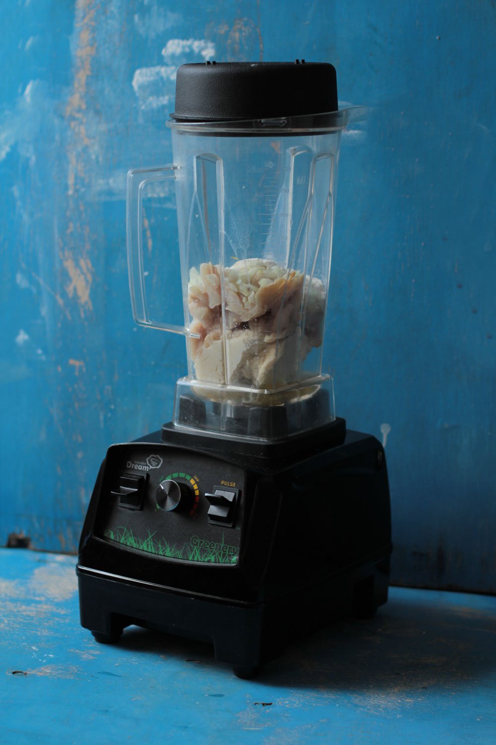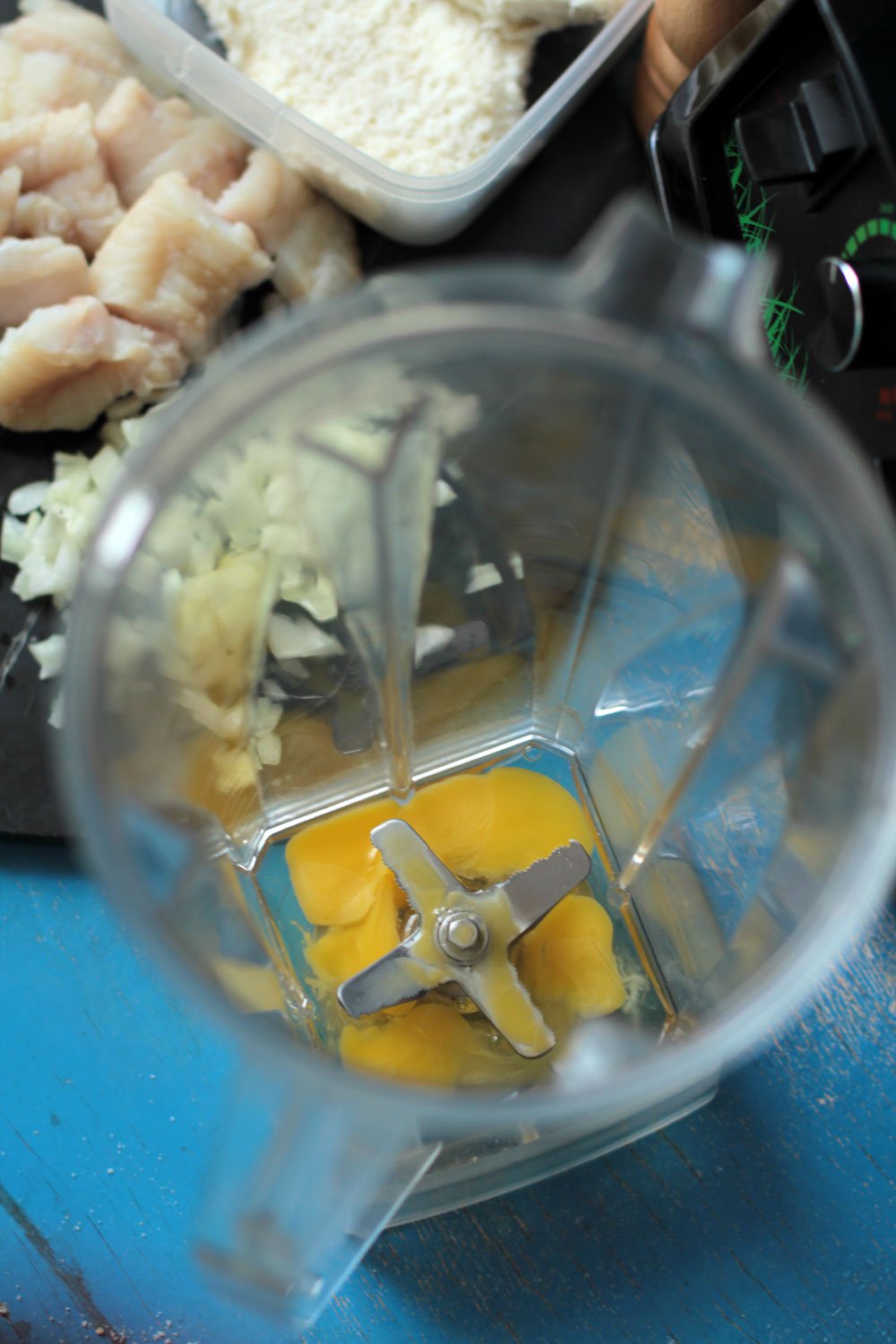 2. Начинаем складывать все ингредиенты в блендер в строгой последовательности, первым кладем яйцо.