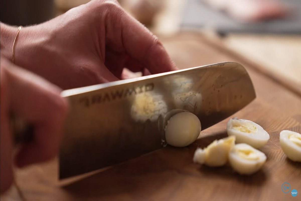 2. Яйца: вскипятите воду, отварите перепелиные яйца 3 мин, затем сразу остудите в холодной воде, очистите и разрежьте пополам.