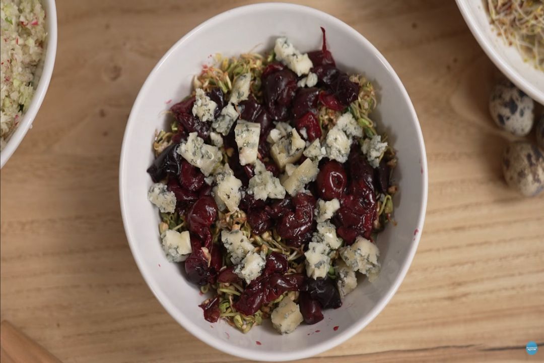Салат с зелёной гречкой, вишней и сыром с плесенью — изысканный салат с пророщенной гречкой, сочной вишней, мягким сыром с благородной плесенью и мёдово-оливковой заправкой.