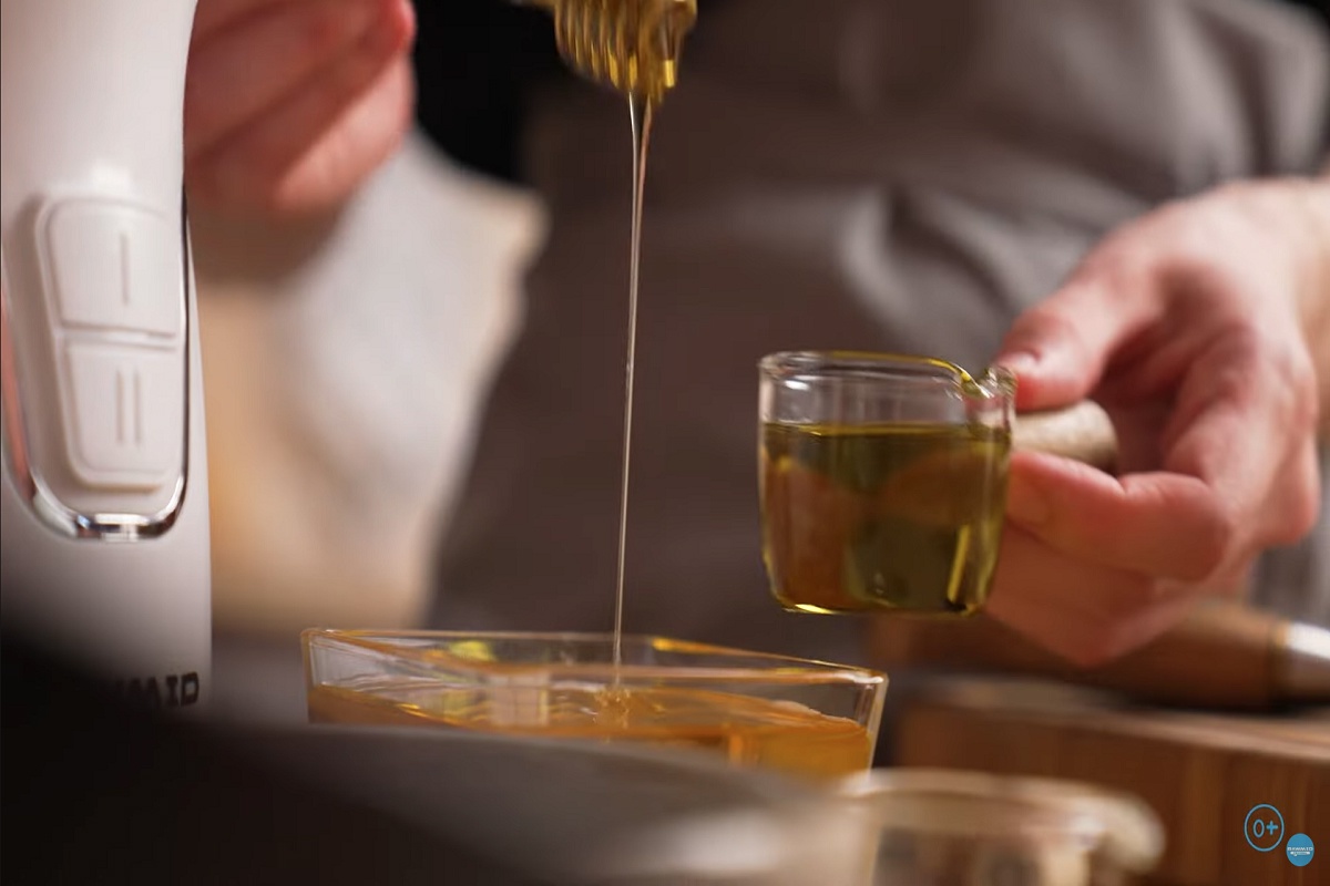 3. Заправка: в отдельной посуде смешайте мёд и масло, добавьте щепотку соли и перца.