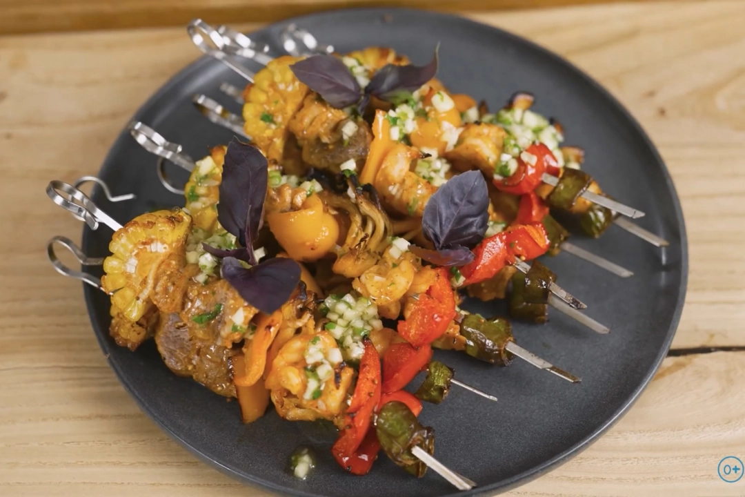 Шашлык в гавайском стиле — это сочетание тигровых креветок, сочной свинины, ананаса, болгарского перца и кукурузы, замаринованных в пряных специях. Блюдо готовится в аэрогриле или шашлычнице, обретая золотистую корочку. Особую пикантность придают острые и сладкие ингредиенты, а дымогенератор добавляет аромата костра. Подается с соусом на основе йогурта, чеснока и меда, украшается зеленью. Этот шашлык — гармония сладкого, пряного и соленого, создающая настоящий гастрономический взрыв.