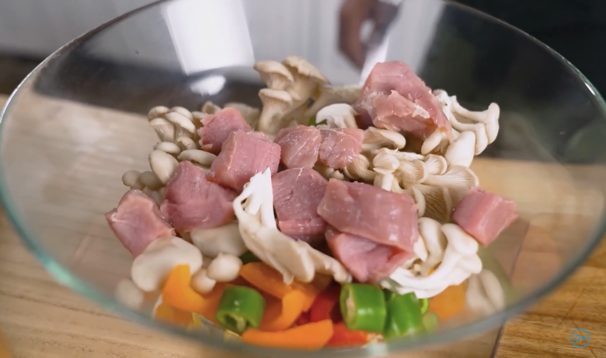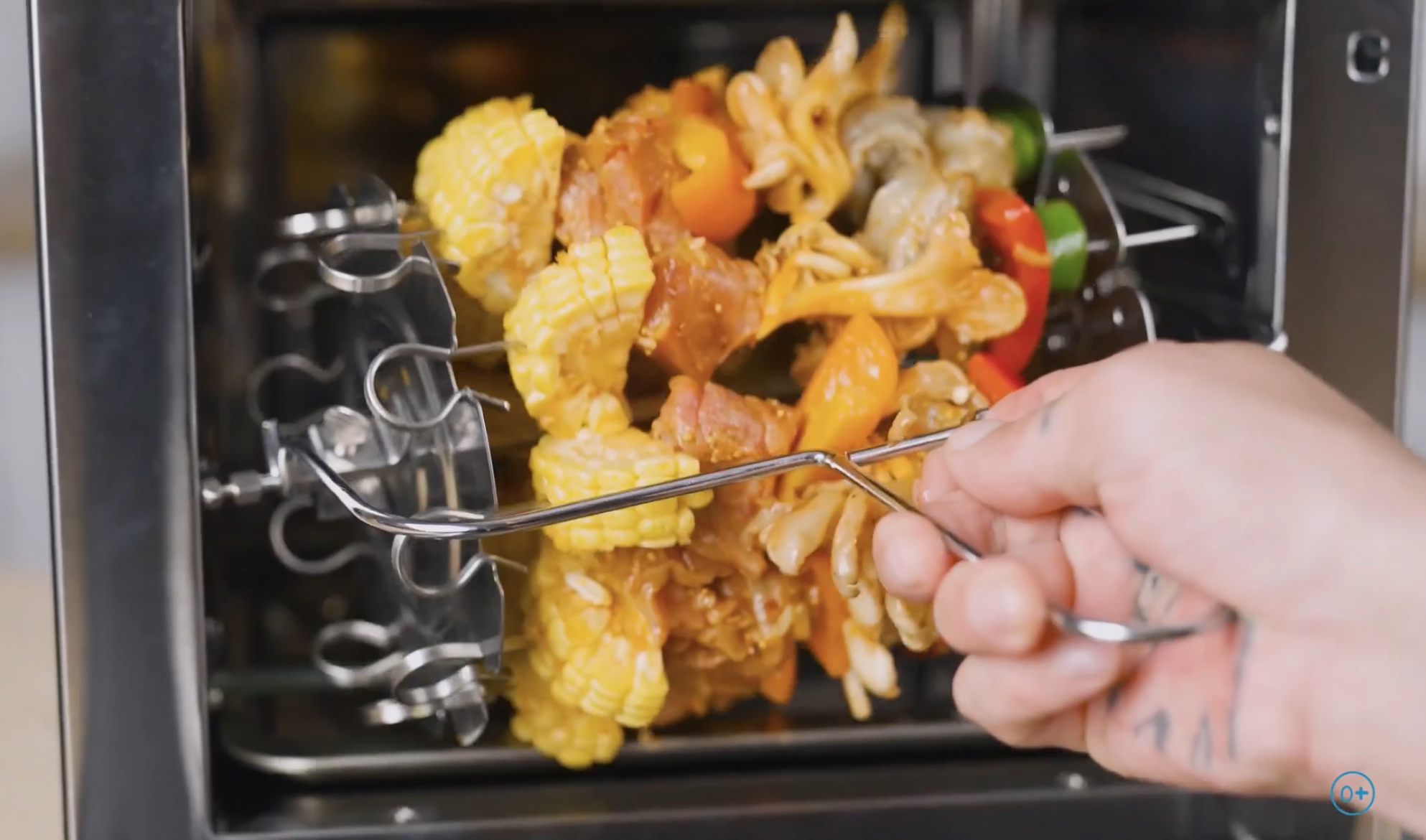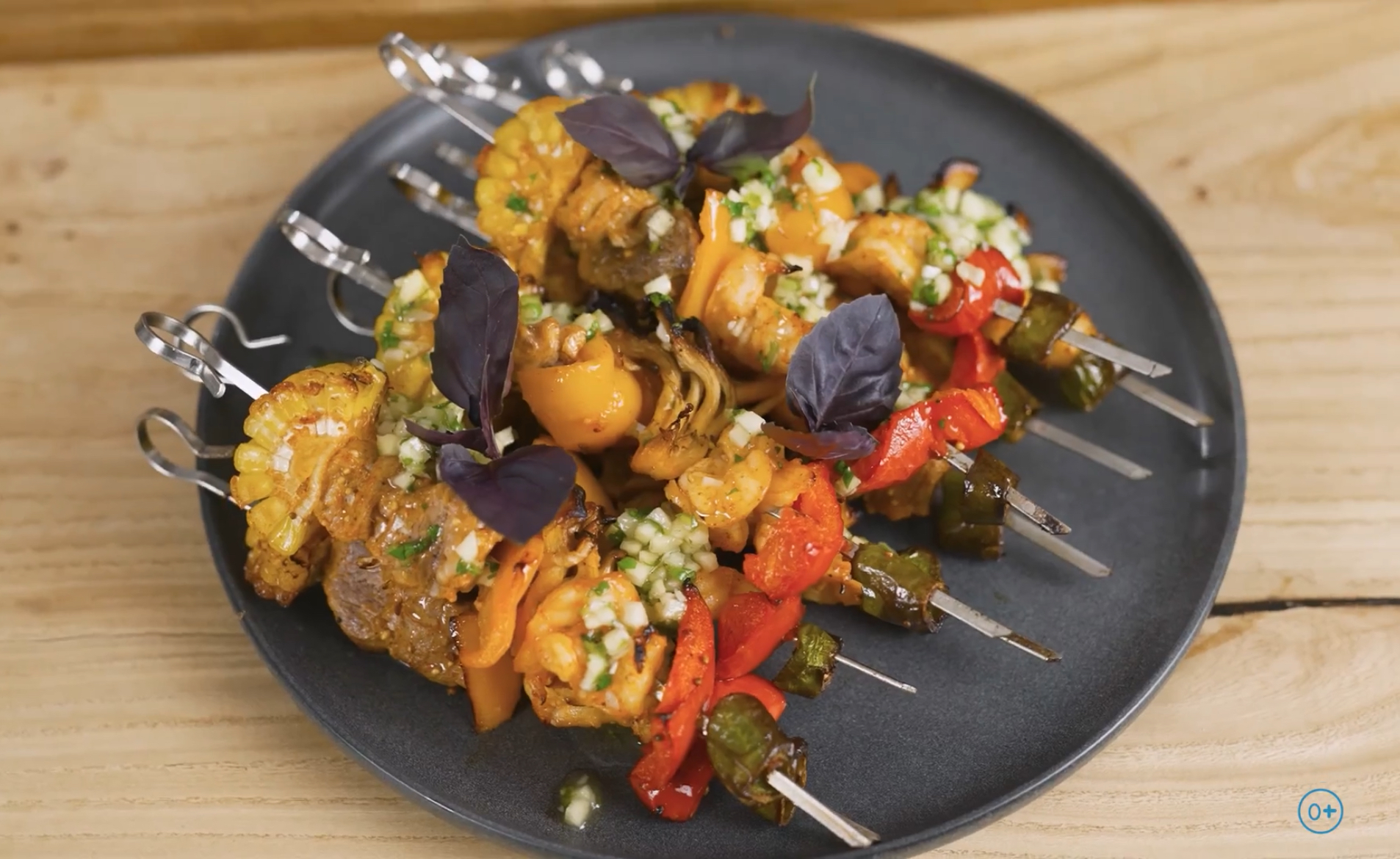 4. Наденьте ингредиенты в произвольном порядке на шампуры и готовьте в аэрогриле или шашлычнице.