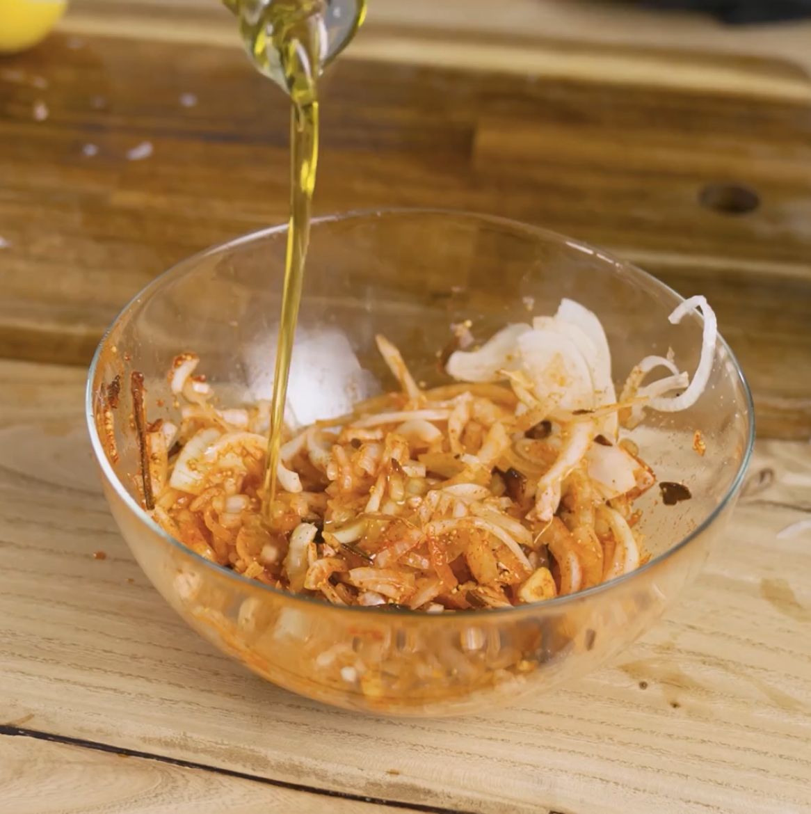 3. Смешайте лук, чеснок, корицу, мёд, растительное и оливковое масло, специи, чеснок и чили.