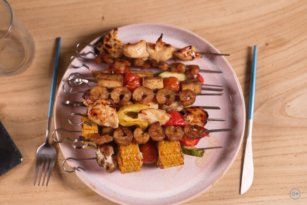 Шашлычки к новогоднему столу включают три варианта: куриные, из креветок и тофу с овощами. Каждый вид готовится с уникальным маринадом: курица — с медом, горчицей и специями; креветки — с соевым соусом, цитрусовыми и чесноком; тофу — с соевым соусом, оливковым маслом и специями. Ингредиенты нанизываются на шампура и запекаются в аэрофритюрнице. Это универсальное блюдо подходит и для мясоедов, и для вегетарианцев.