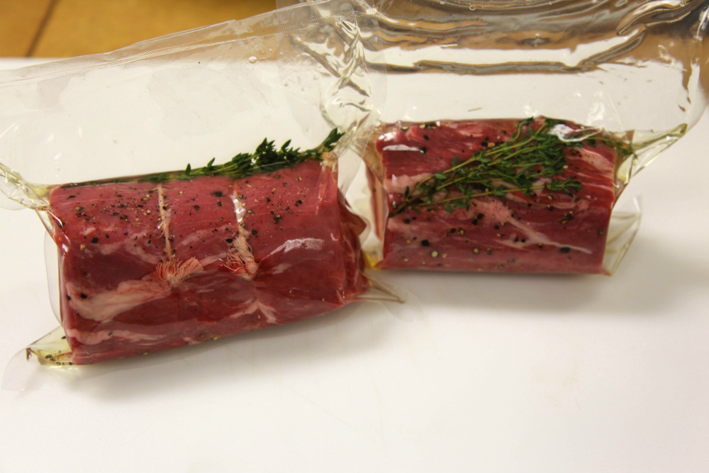 Обратите внимание, что филе в су виде очень эффективно впитывает травы, чеснок и прочие приправы. Поэтому, приправляя говядину перед отправкой в сувидницу, сыпьте заведомо меньше, чем если бы Вы собирались варить её или жарить.