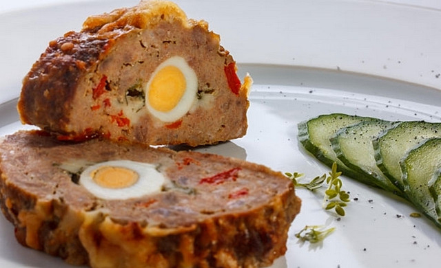 Выкладываем слой фарша в прямоугольную алюминиевую формочку (можно и пластмассовую). Помещаем на него огурцы, на них — ещё один, тонкий, слой фарша, а затем и яйца.