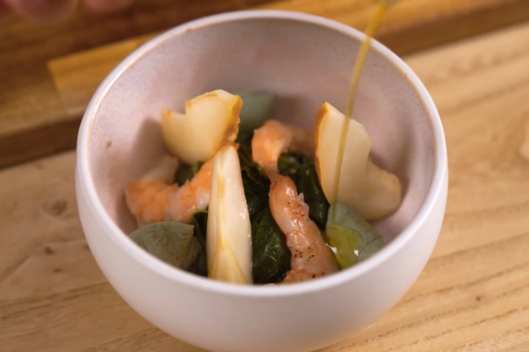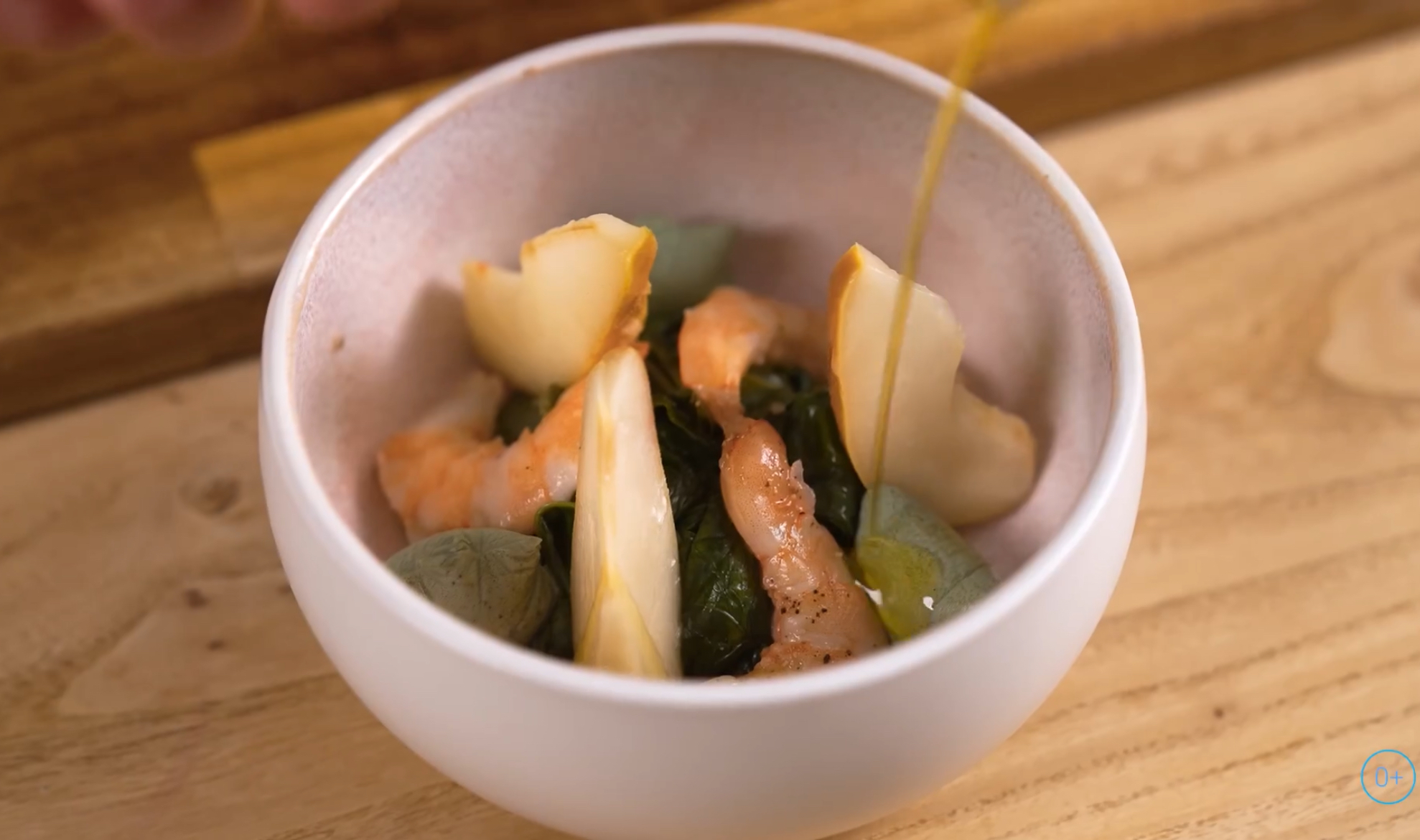 Тёплый салат с креветками — изысканное блюдо, в котором нежные креветки, приготовленные су-вид, сочетаются с томлёным шпинатом и карамелизированной грушей. Лёгкий омлет, приготовленный в форме подушечек, добавляет текстурное разнообразие, а сливочное масло, белое вино и ароматные травы подчёркивают вкусовую гармонию. Этот салат сочетает сладость, свежесть и нежность, создавая сбалансированное гастрономическое удовольствие.