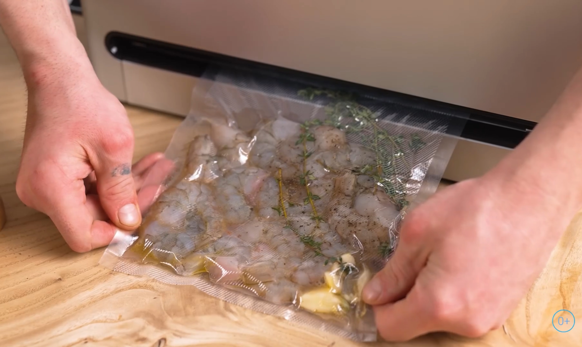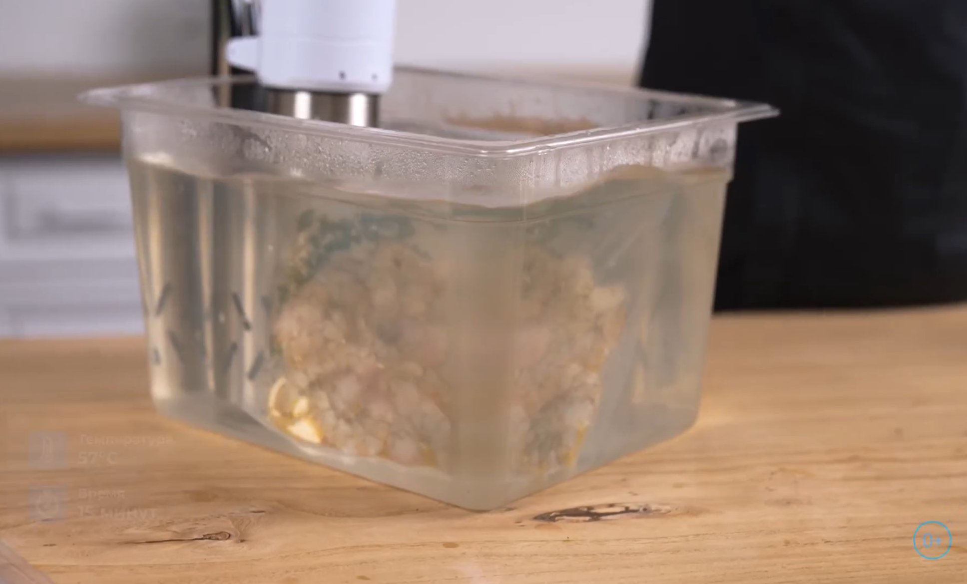 1. Очистите креветки, вакуумируйте с оливковым маслом, белым вином, солью, травами, чесноком.