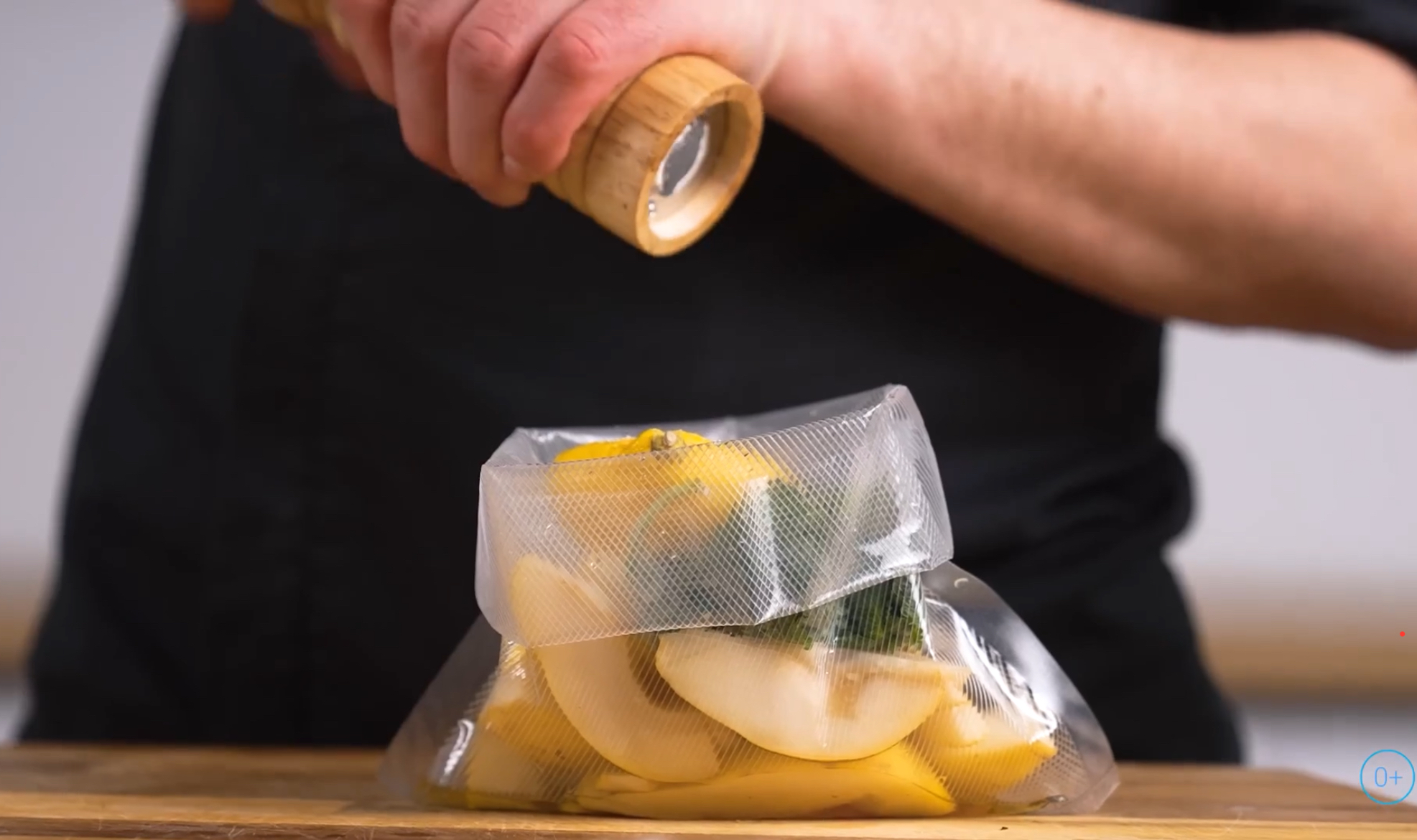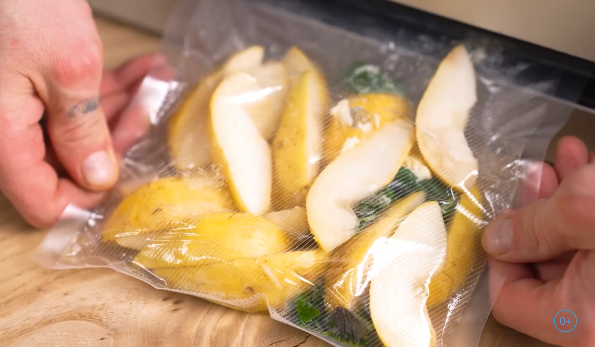 1. Грушу нарежьте дольками, вакуумируйте с маслом, коньяком, мелиссой.