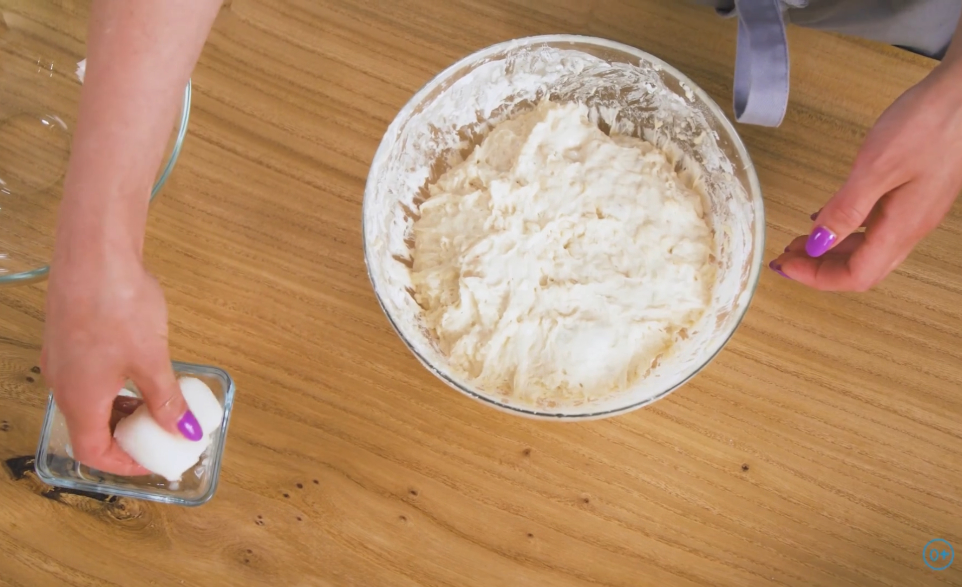 2. Добавьте молоко, муку, соль. Замешайте тесто, дайте отдохнуть 10 минут.