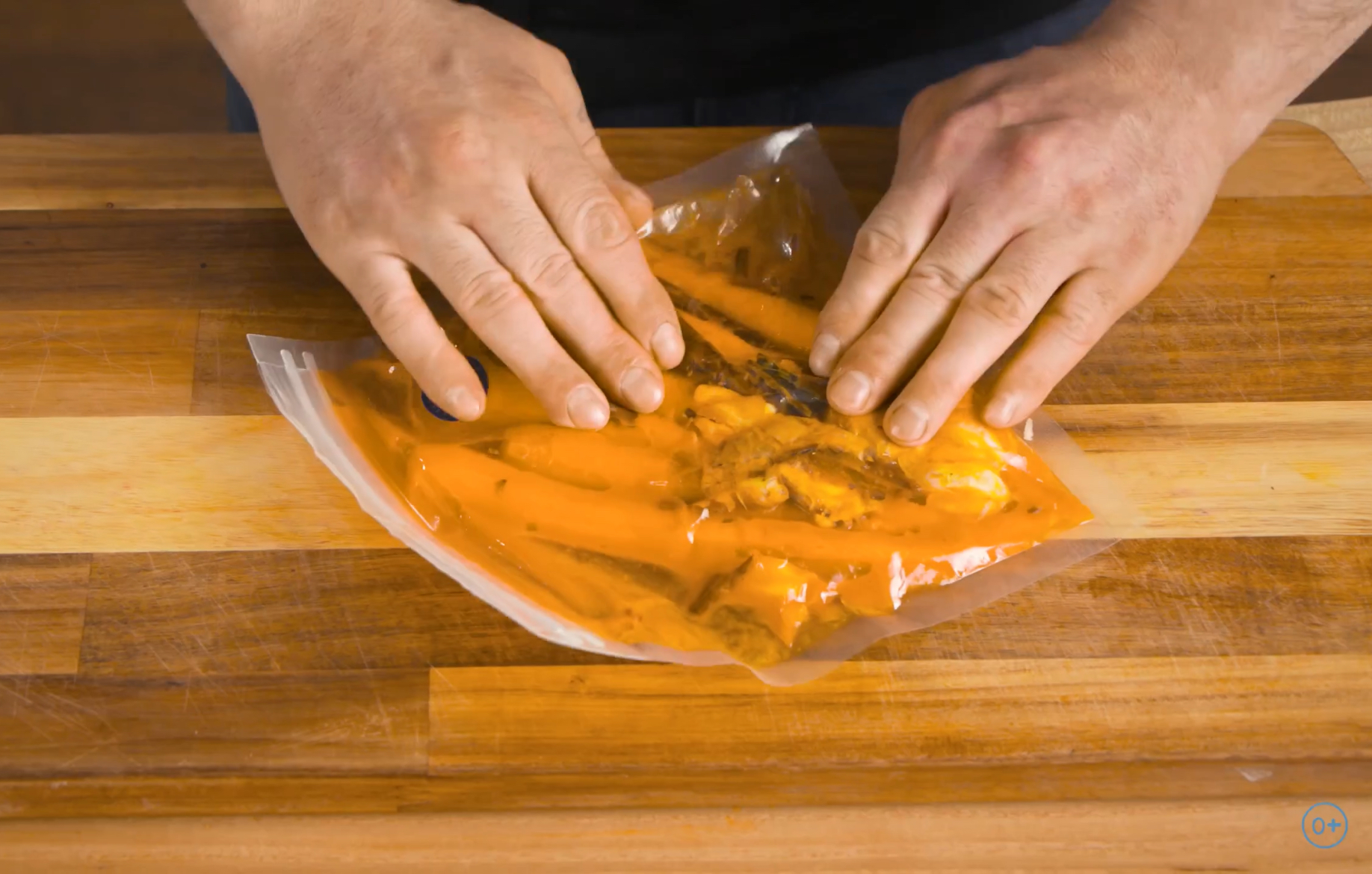 2. Выложить в вакуумный пакет, добавить специи (корица, чеснок), масло и сок.