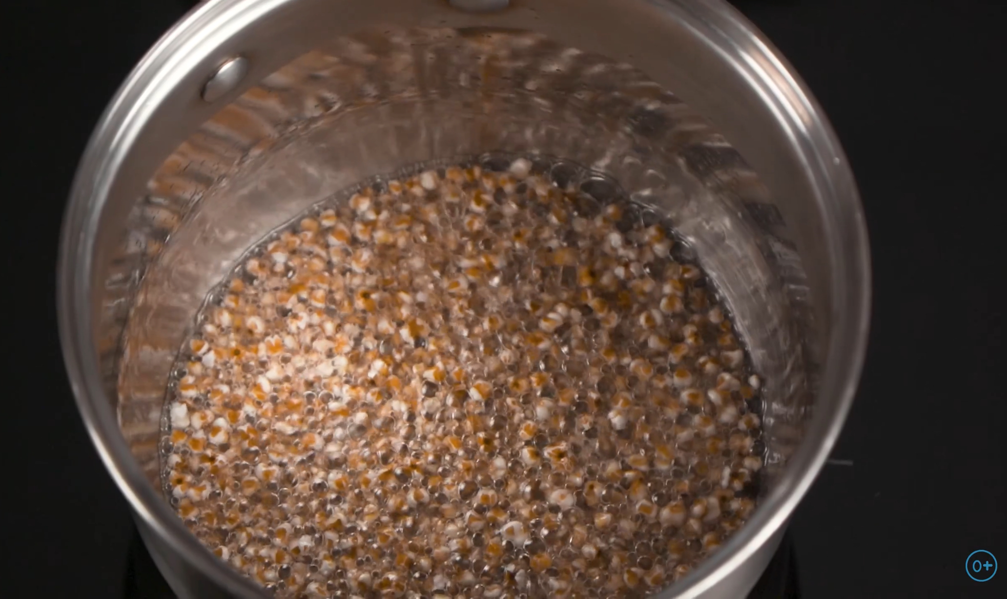 Для этого нам надо разогреть масло до 170°C и обжарить гречку до раскрытия.