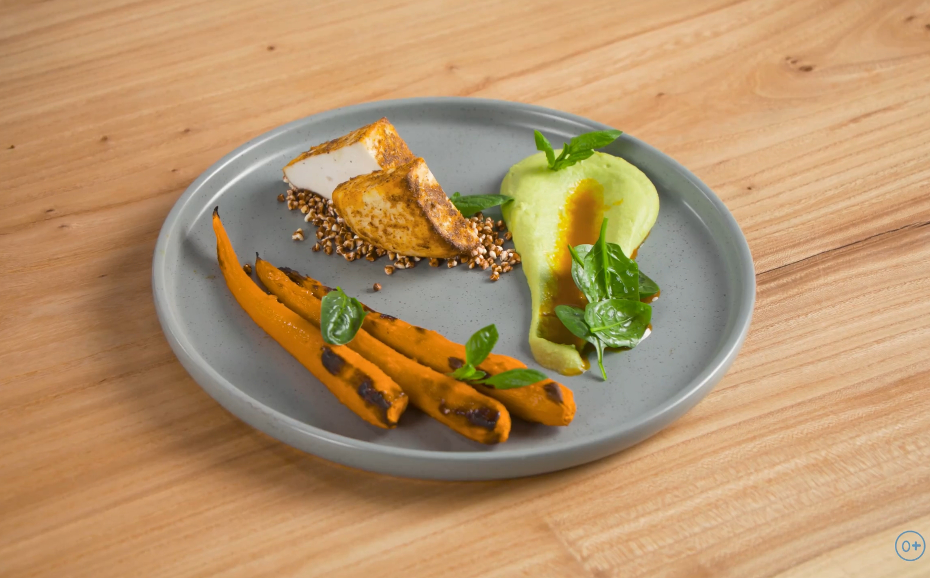 Запеченный адыгейский сыр с гарнирами — это изысканное вегетарианское блюдо, в котором сочетаются насыщенные вкусы и текстуры. Адыгейский сыр, пропитанный специями, запекается до золотистой корочки, создавая эффект куриного вкуса. В качестве гарнира подается морковь, приготовленная в су-виде и карамелизированная с коричневым сахаром, а также нежное пюре из молодого горошка. Блюдо дополняет пикантный морковный соус и хрустящий попкорн из гречки, который балансирует сладость моркови. Это полезное, легкое и сбалансированное по вкусу блюдо.