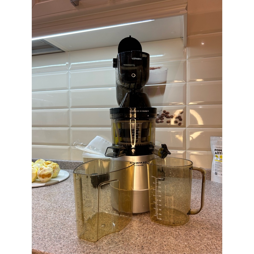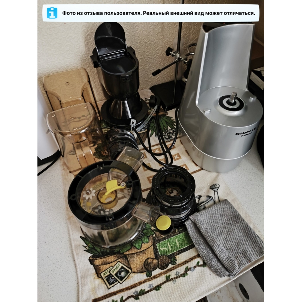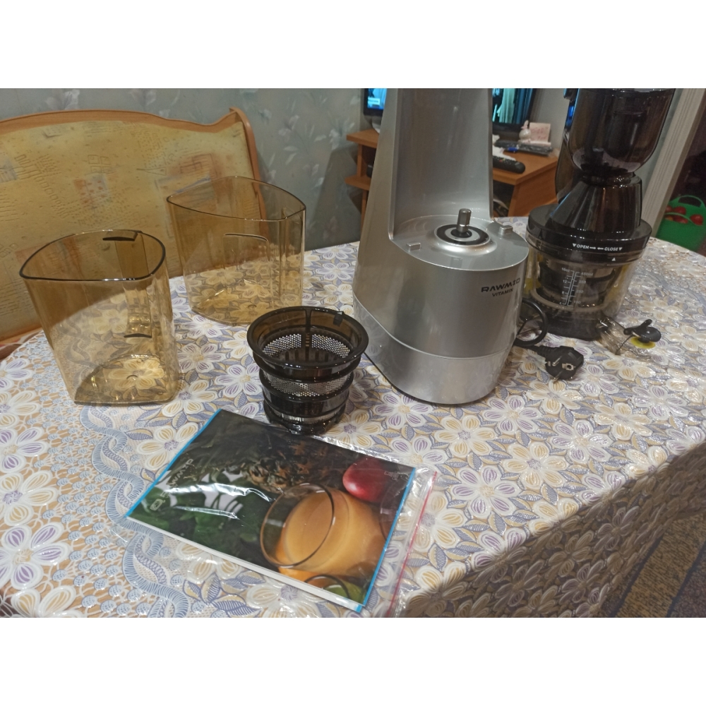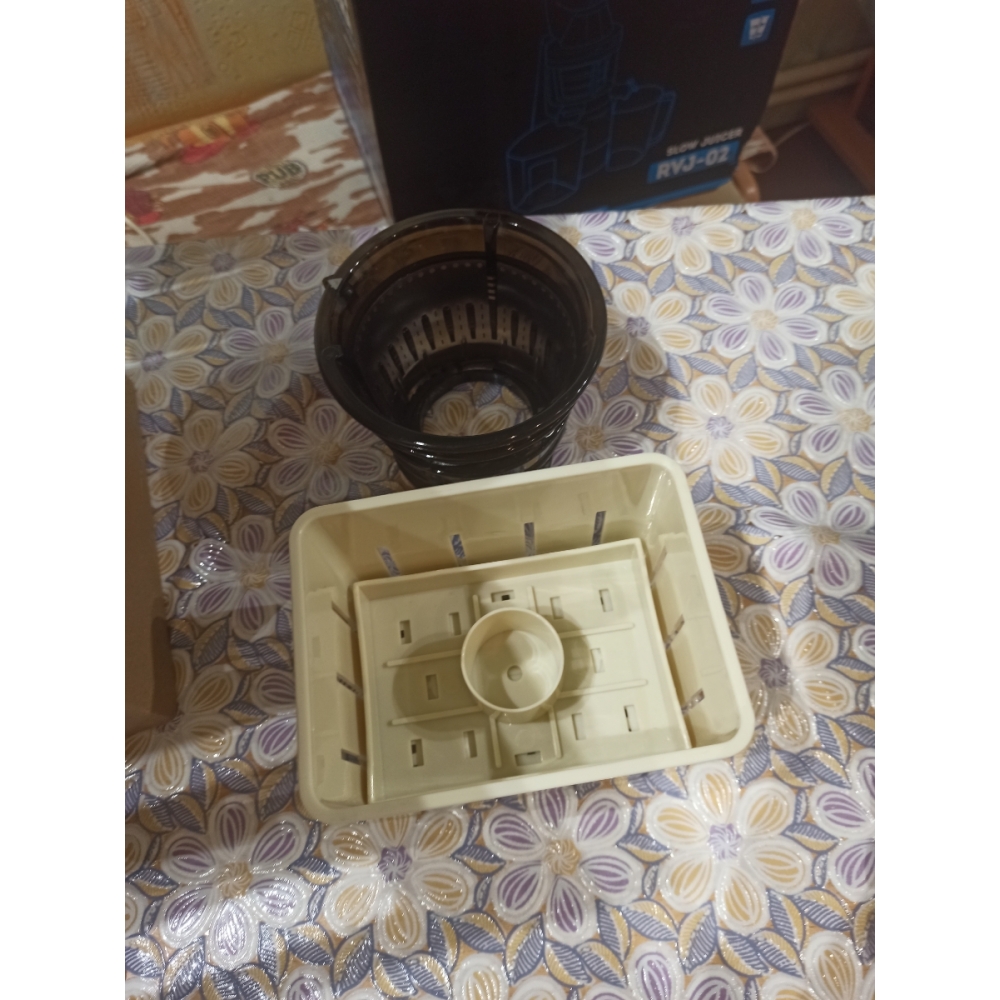 В стандартный комплект соковыжималки Vitamin RVJ-02 входит сетка с мелкими отверстиями для соков, экран-измельчитель для мороженого, а также специальный пресс для тофу. В качестве подарка за фото-отзыв клиенты получают дополнительное сито с крупными отверстиями для смузи и пюре.