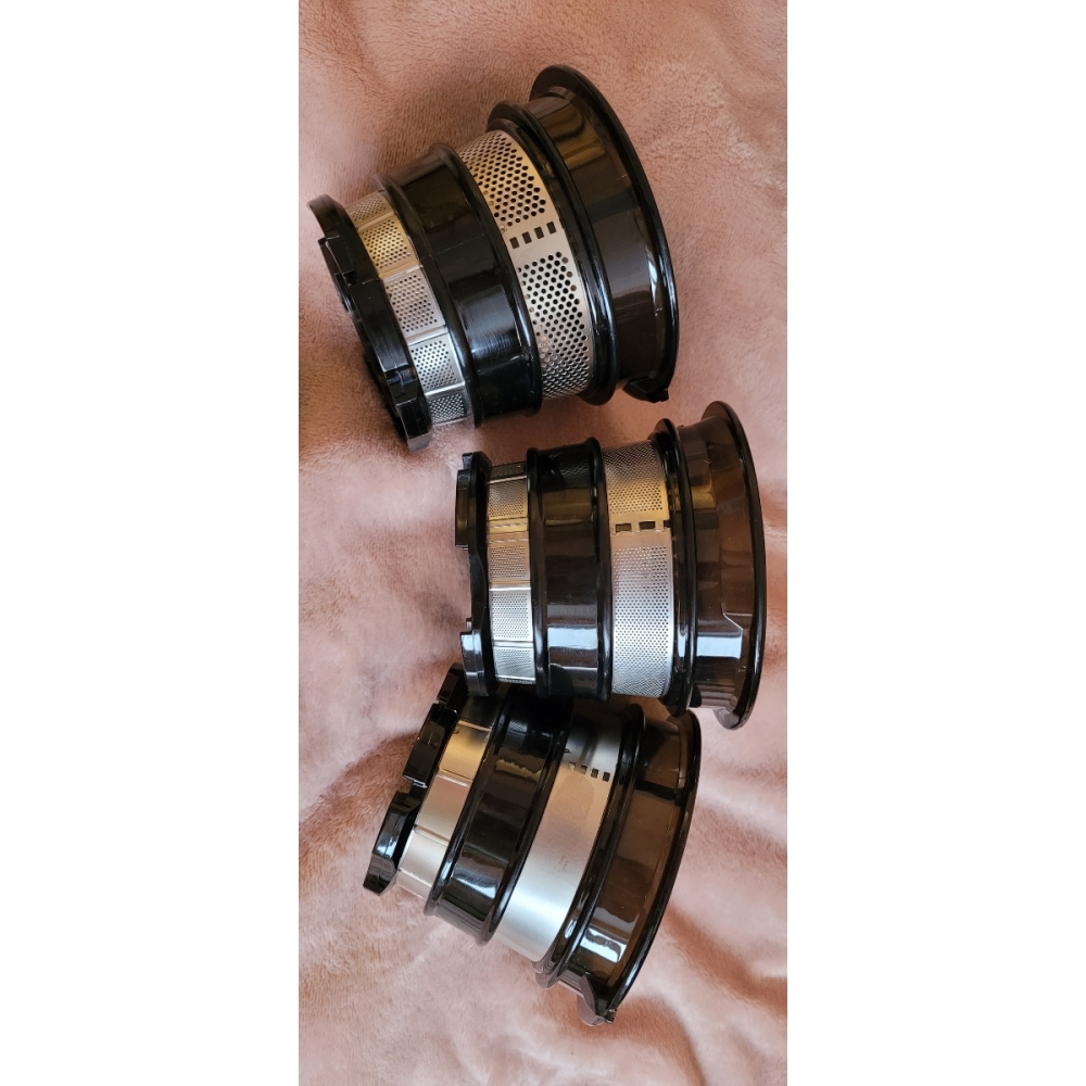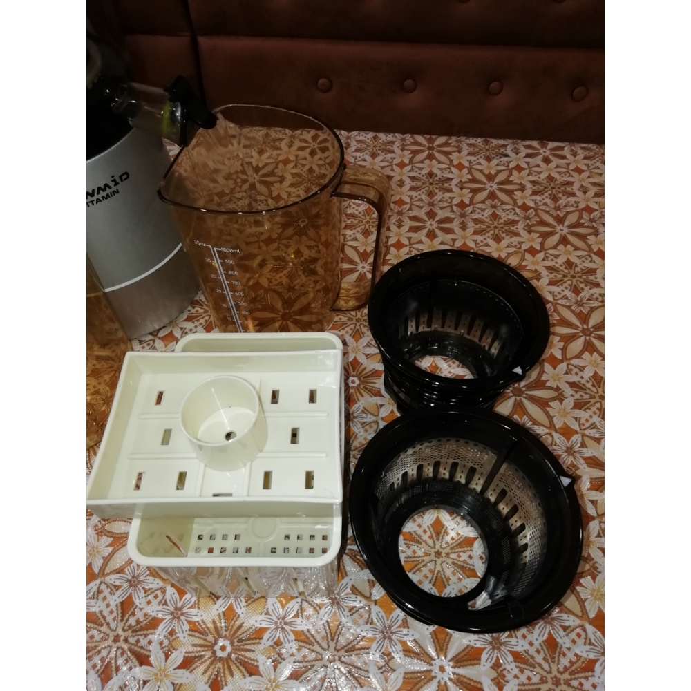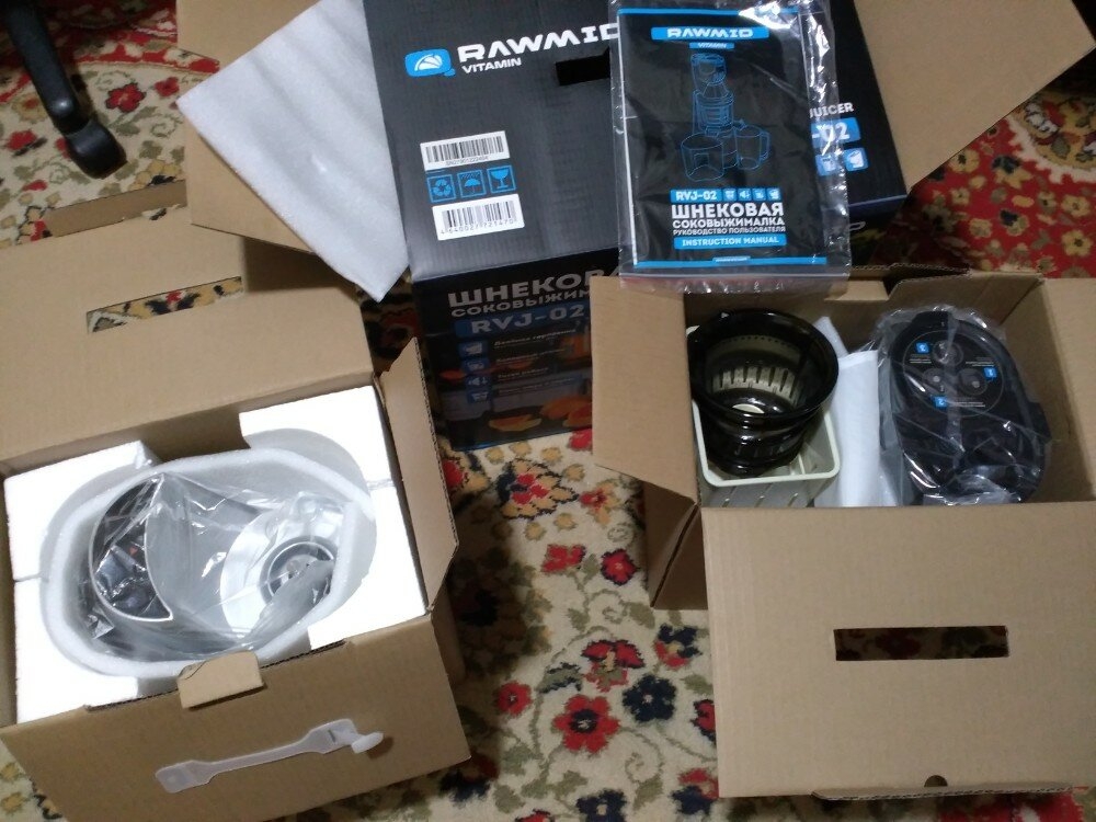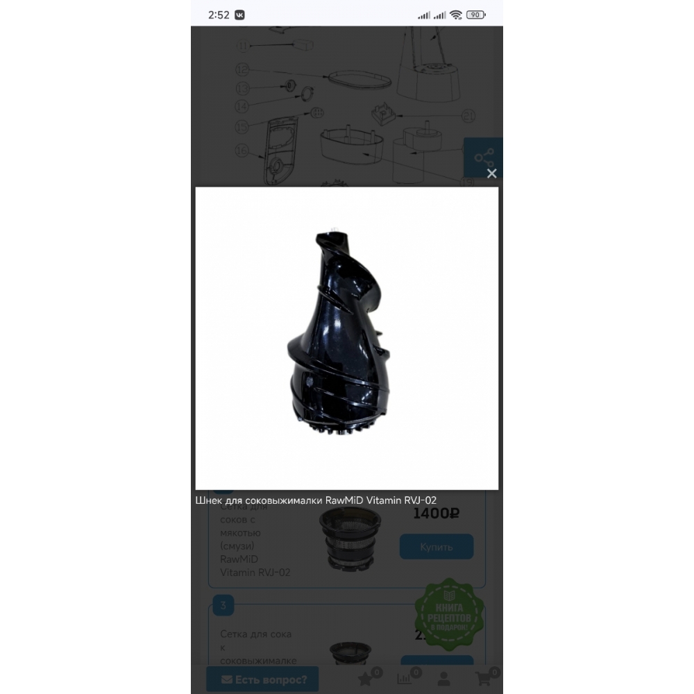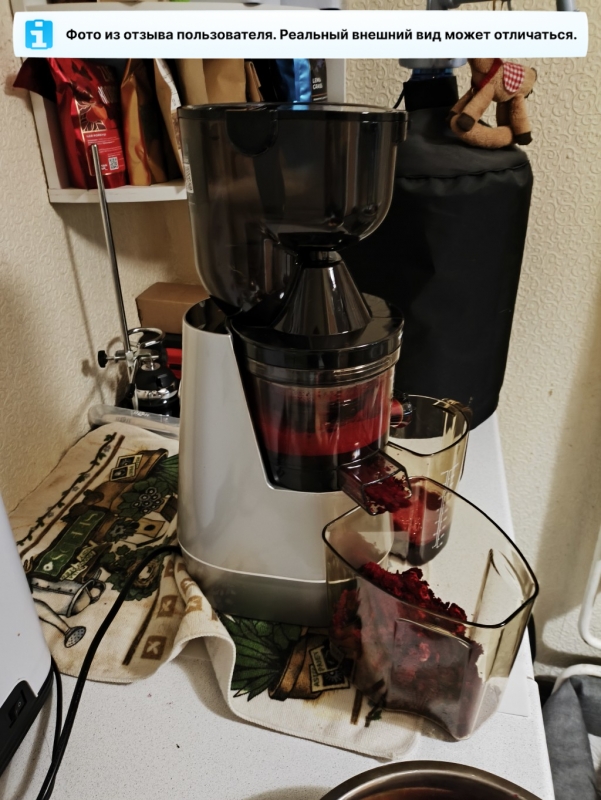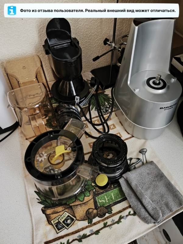 В стандартный комплект соковыжималки Vitamin RVJ-02 входит сетка с мелкими отверстиями для соков, экран-измельчитель для мороженого, а также специальный пресс для тофу. В качестве подарка за фото-отзыв клиенты получают дополнительное сито с крупными отверстиями для смузи и пюре.
