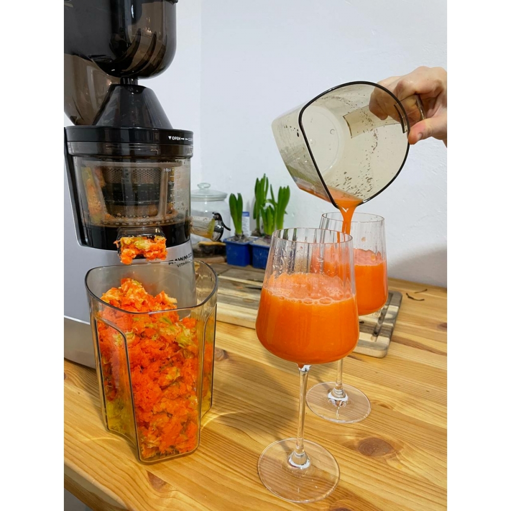 Низкие обороты шнека (38 об/мин) обеспечивают эффективный, но в то же время бережный отжим – без нагрева и сильного окисления продуктов. Это позволяет сохранить в свежевыжатых соках максимальное количество полезных веществ – витаминов, энзимов и антиоксидантов.