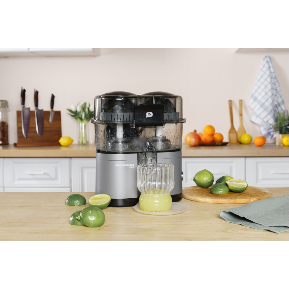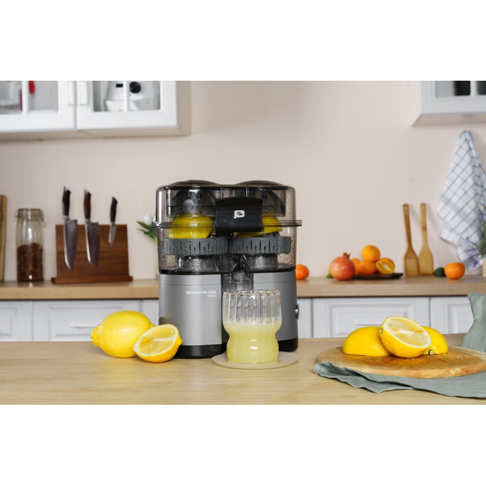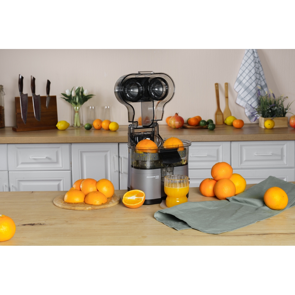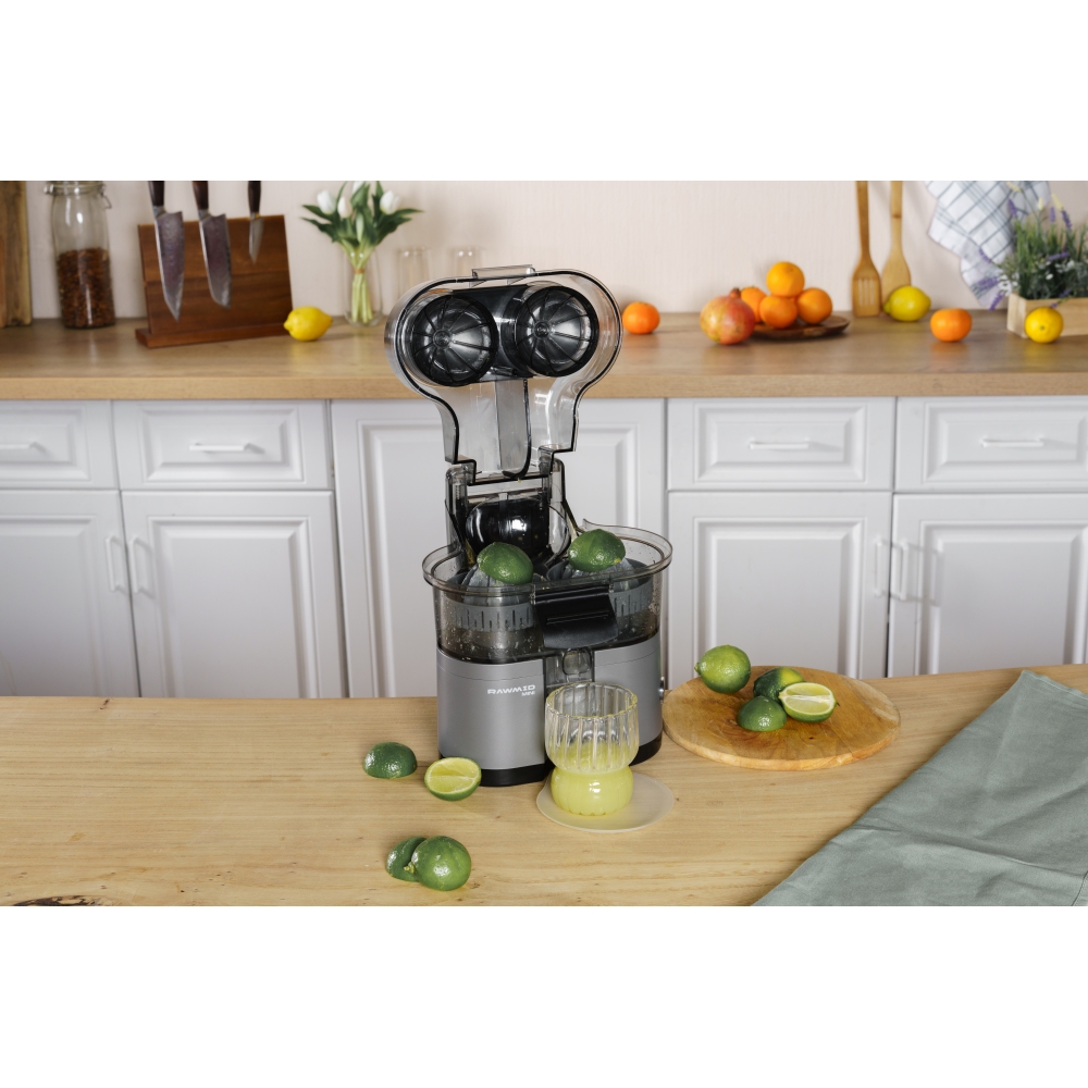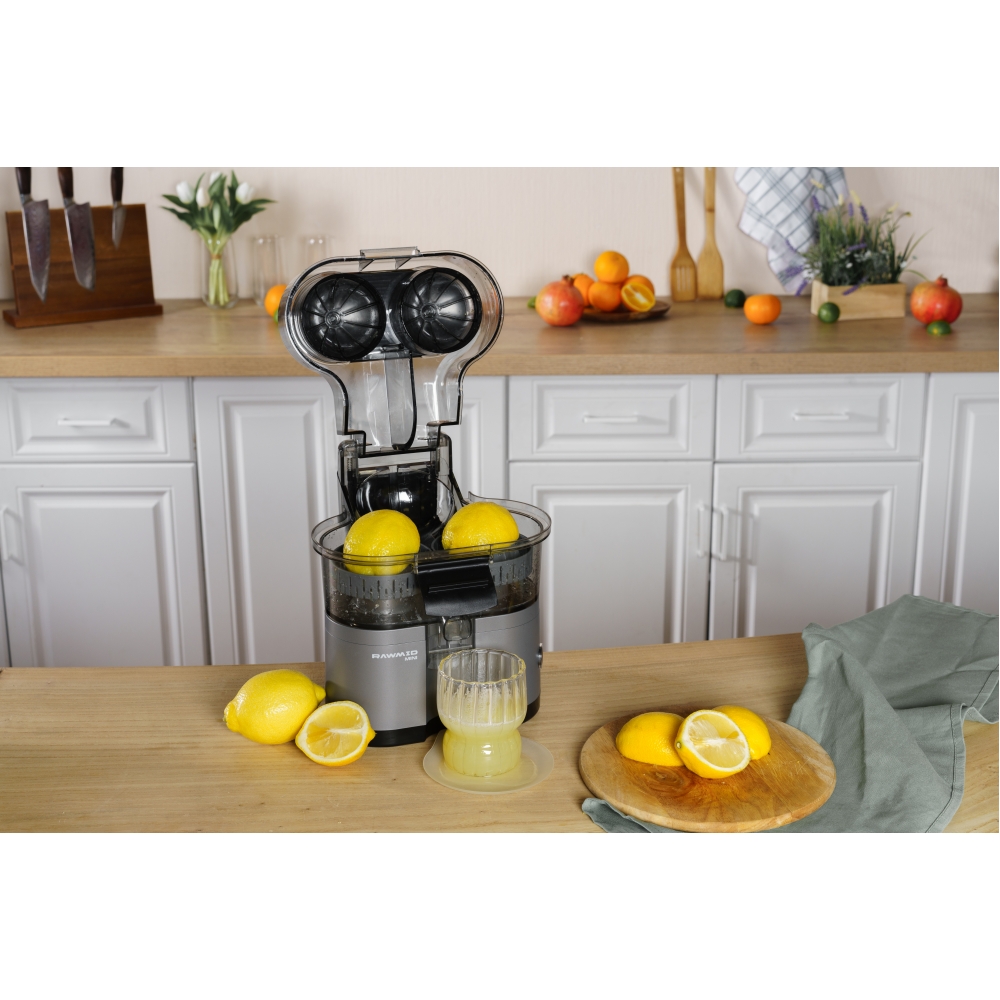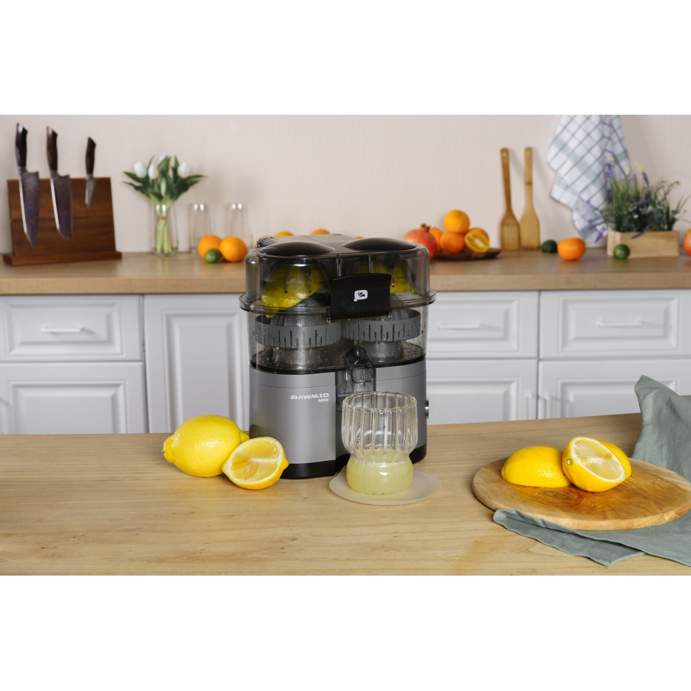 В отличие от большинства моделей, где необходимо удерживать фрукт руками, RAWMID Mini RMJ-02 полностью автоматизирует процесс: встроенный пресс поднимает двойной конус и прижимает половинки фрукта к крышке, извлекая максимум сока. Просто нажмите кнопку — всё остальное прибор сделает сам!